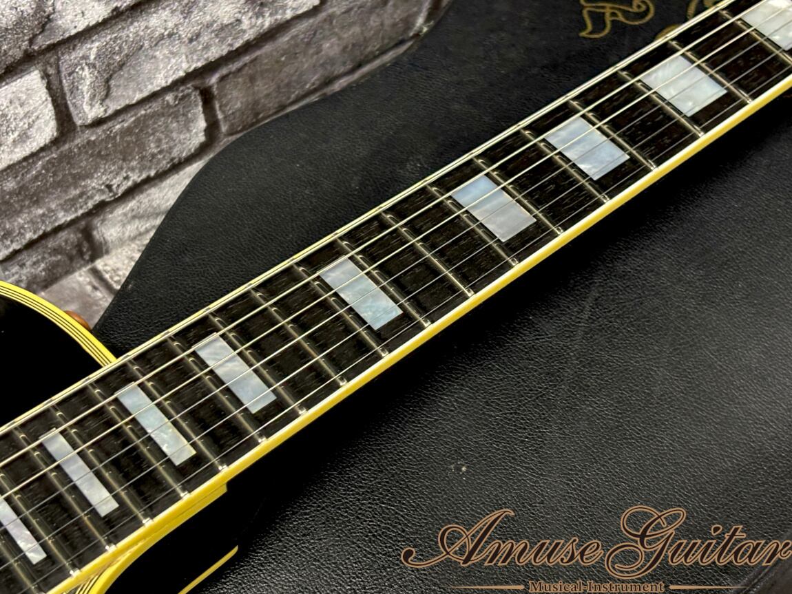 まずそのスペックですが、ウッドマテリアルとしては王道の内容にて、AAAグレードの2Pハードメイプルトップ、1Pマホガニーバック、1Pマホガニーネックのセットネック構造(ディープジョイント方式)となりますが、近年ではCustom Shopラインでも指板をリッチライトへと移行する中、こちらは今ではどのブランドも確保が難しくなった希少かつ高級材となる漆黒のエボニー材を採用。またエボニーブラックのフィニッシュについても、高級感溢れるグロス仕上げとなっております。その他のスペック&特徴としては、まず何と言ってもブラックカラーとの抜群のマッチングを魅せるゴールドハードウェア仕様。こちらはヘッドのダイヤモンドインレイ等と併せて、1958年仕様ならではのiドットロゴ、ボリュート無しネック、グローヴァーペグが確認できます。その他としましては、ABR-1&テイルピースブリッジ、ポインターワッシャー&ソーサータイプノブ、サイドジャックは強固な金属製、シャープでモダンな印象を受けるピックガード、ネック厚は厚め(Profile: Rounded)で鳴りは抜群。スケールはミディアム、ナット幅は約43mm、指板ラディアスは12R、フレットサイズはミディアムジャンボとなっています。
