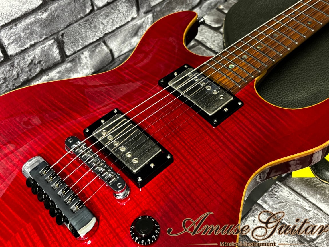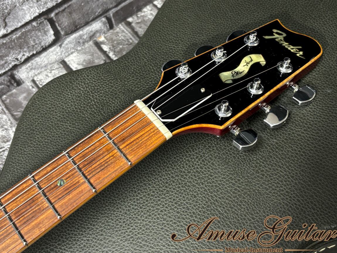 こちらのスペックですが、ボディには1Pマホガニーバック/木目が美しいフレイムメイプルトップ。ネックにはマホガニーに、指板はローズウッド(パーフェローの可能性もございます)。ナット(ボーン)幅約43mm、22フレット、12R、ミディアムスケール、ディープジョイント方式のセットネック構造。ナット&フレットは交換されており、フレットはステンレス製のミディアムジャンボとなっております。その他としましてはオリジナルヘッドストック、ヘッドトップにはフェンダー&Robben Fordのロゴ、3:3のシャーラー製ロトマチックペグ(Fender刻印入り)、アバロンドットポジション、エスカッションマウントハムバッカーピックアップ×2、チューン・O・マチック&ファインチューナー付きテイルピースブリッジ、2ヴォリューム/2トーン・3wayトグルピックアップセレクター・コイルタップON/OFFのコントロール、シャーラーロックピン(換装)、ボディサイドジャックとなっております。