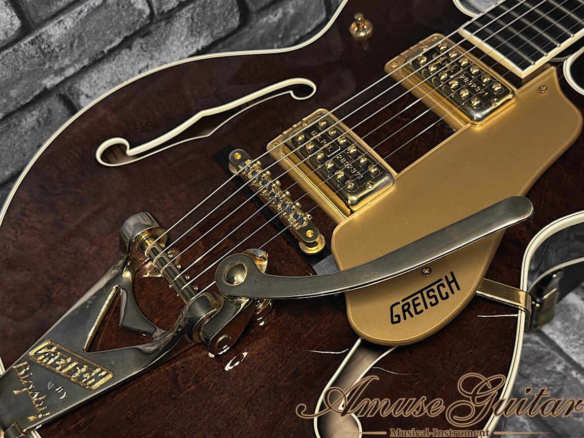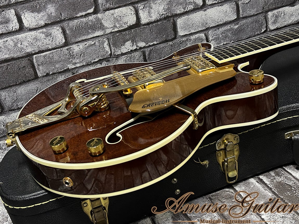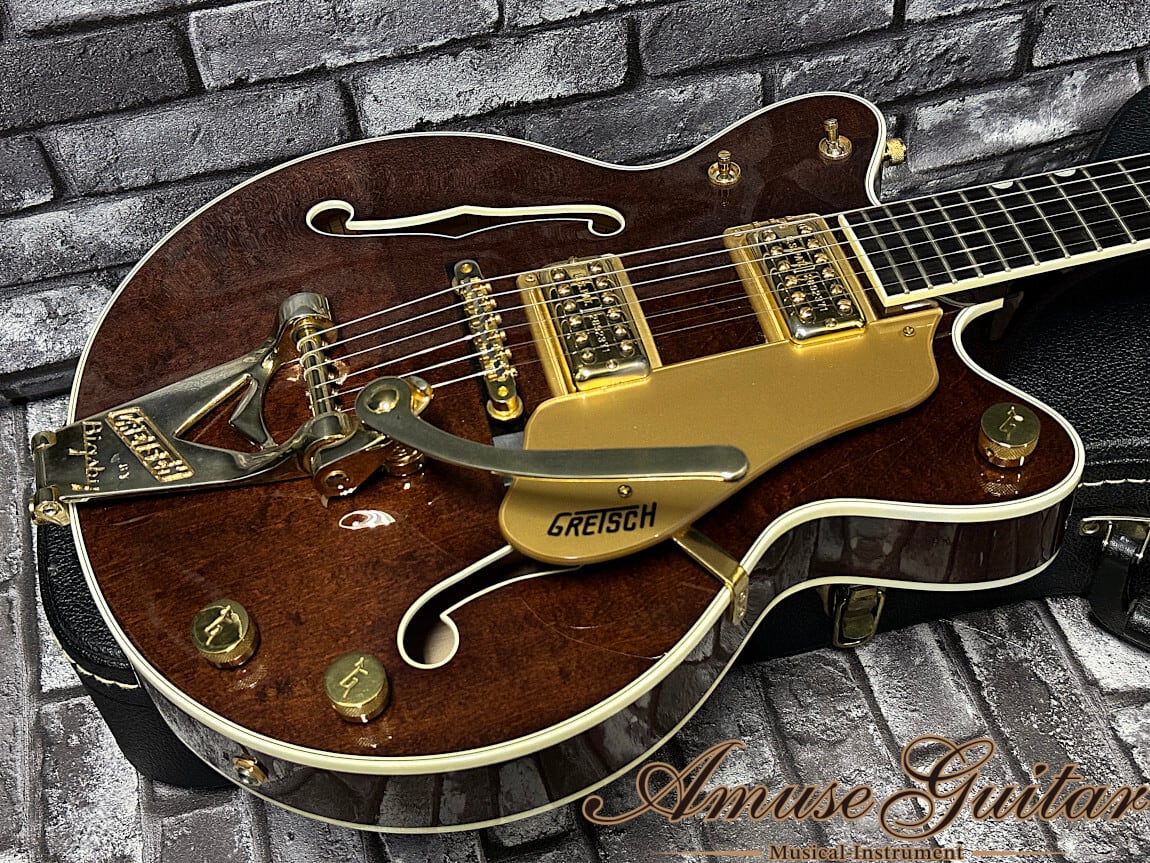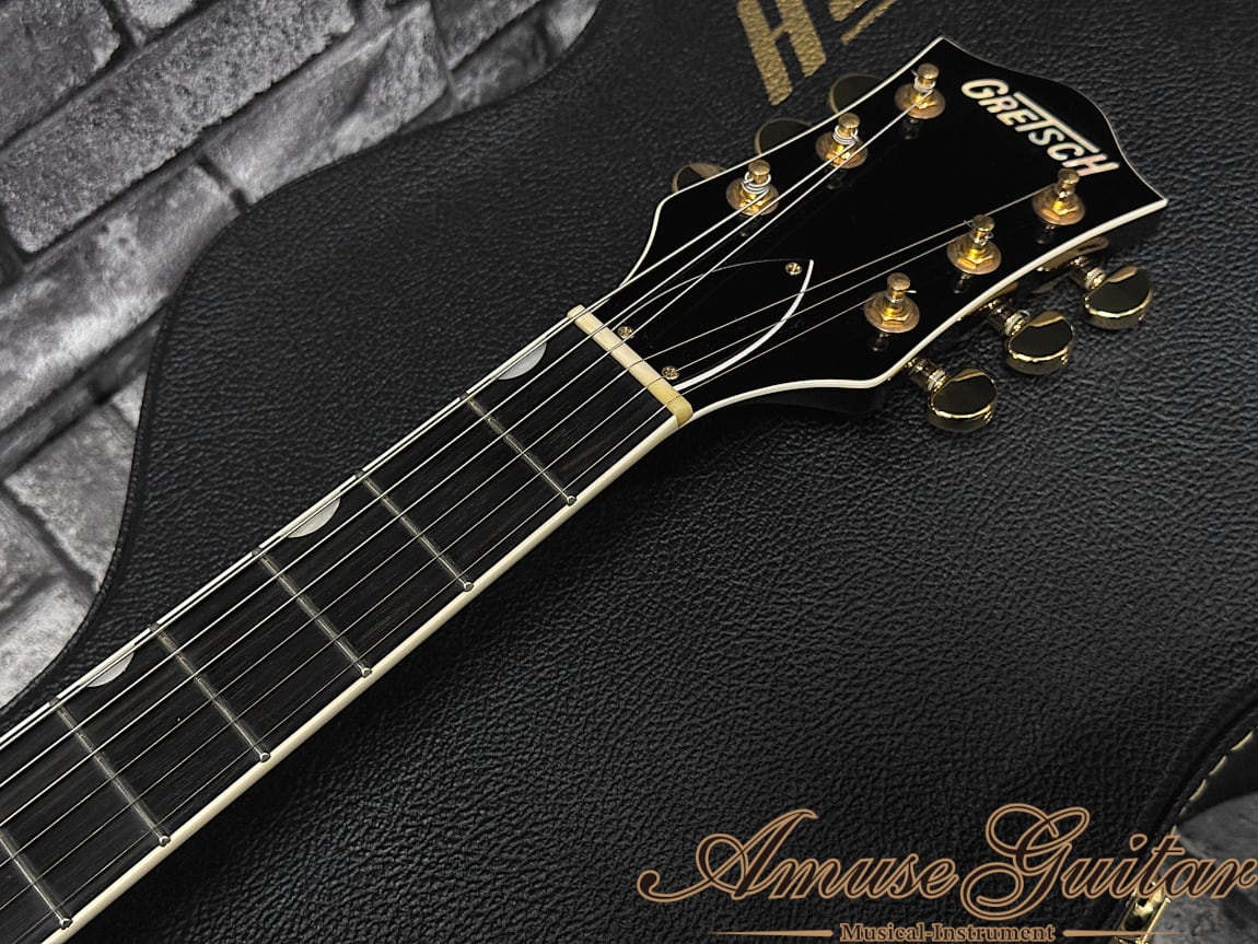 まずスペックとしては、クラシックスタイルを崩さないまま14インチ幅の小ぶりなボディサイズ&ダブルカッタウェイの定番にモダンさをプラスしたスタイルで、アーチドトップのボディにはラミネーテッドメイプル。約57mmボディ厚、そしてブリッジ下に支柱を備えた所謂フルアコ構造。グロスのウォスナットステインフィニッシュ、ヘッド/指板/ボディに高級感のあるバインディングを組み合わせ、ゴージャスでエレガントなルックスは、クラシックカーの様な重厚感と高級感を放ちます。ネックは約43mmナット(ボーン)、12R、22フレット、ミディアムスケール(24.6inch)、メイプルに真っ黒なエボニーフィンガーボードを採用し、ポジションマークはネオクラシック・サムネイルが使われております。GRETSCHロゴ入りのビグスビーユニット(ストリングスルータイプ)とアジャスタブルチューン・O・マチックブリッジを採用。その他としては、グレッチロゴの入ったゴールドピックガード、”G”刻印のコントロールノブ、グローバー製チューナー、グレッチダイヤルストラップピンなどが挙げられます。