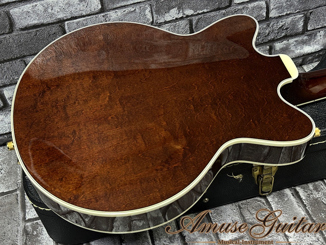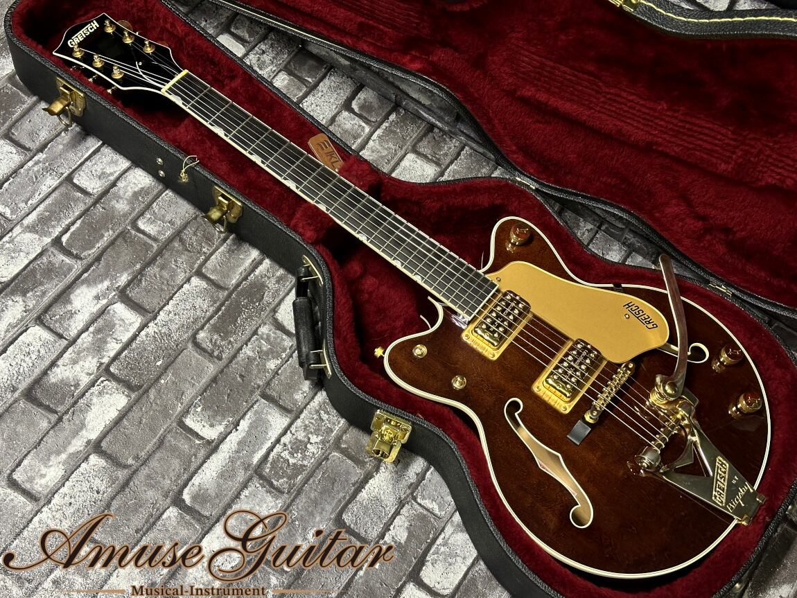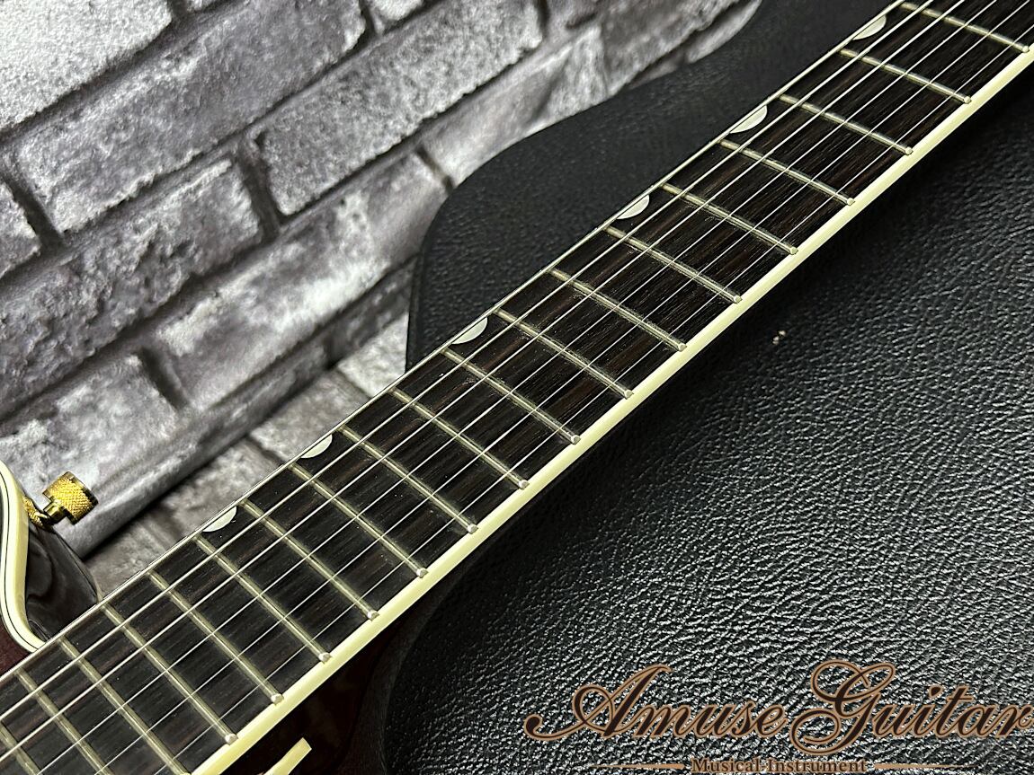 まずスペックとしては、クラシックスタイルを崩さないまま14インチ幅の小ぶりなボディサイズ&ダブルカッタウェイの定番にモダンさをプラスしたスタイルで、アーチドトップのボディにはラミネーテッドメイプル。約57mmボディ厚、そしてブリッジ下に支柱を備えた所謂フルアコ構造。グロスのウォスナットステインフィニッシュ、ヘッド/指板/ボディに高級感のあるバインディングを組み合わせ、ゴージャスでエレガントなルックスは、クラシックカーの様な重厚感と高級感を放ちます。ネックは約43mmナット(ボーン)、12R、22フレット、ミディアムスケール(24.6inch)、メイプルに真っ黒なエボニーフィンガーボードを採用し、ポジションマークはネオクラシック・サムネイルが使われております。GRETSCHロゴ入りのビグスビーユニット(ストリングスルータイプ)とアジャスタブルチューン・O・マチックブリッジを採用。その他としては、グレッチロゴの入ったゴールドピックガード、”G”刻印のコントロールノブ、グローバー製チューナー、グレッチダイヤルストラップピンなどが挙げられます。