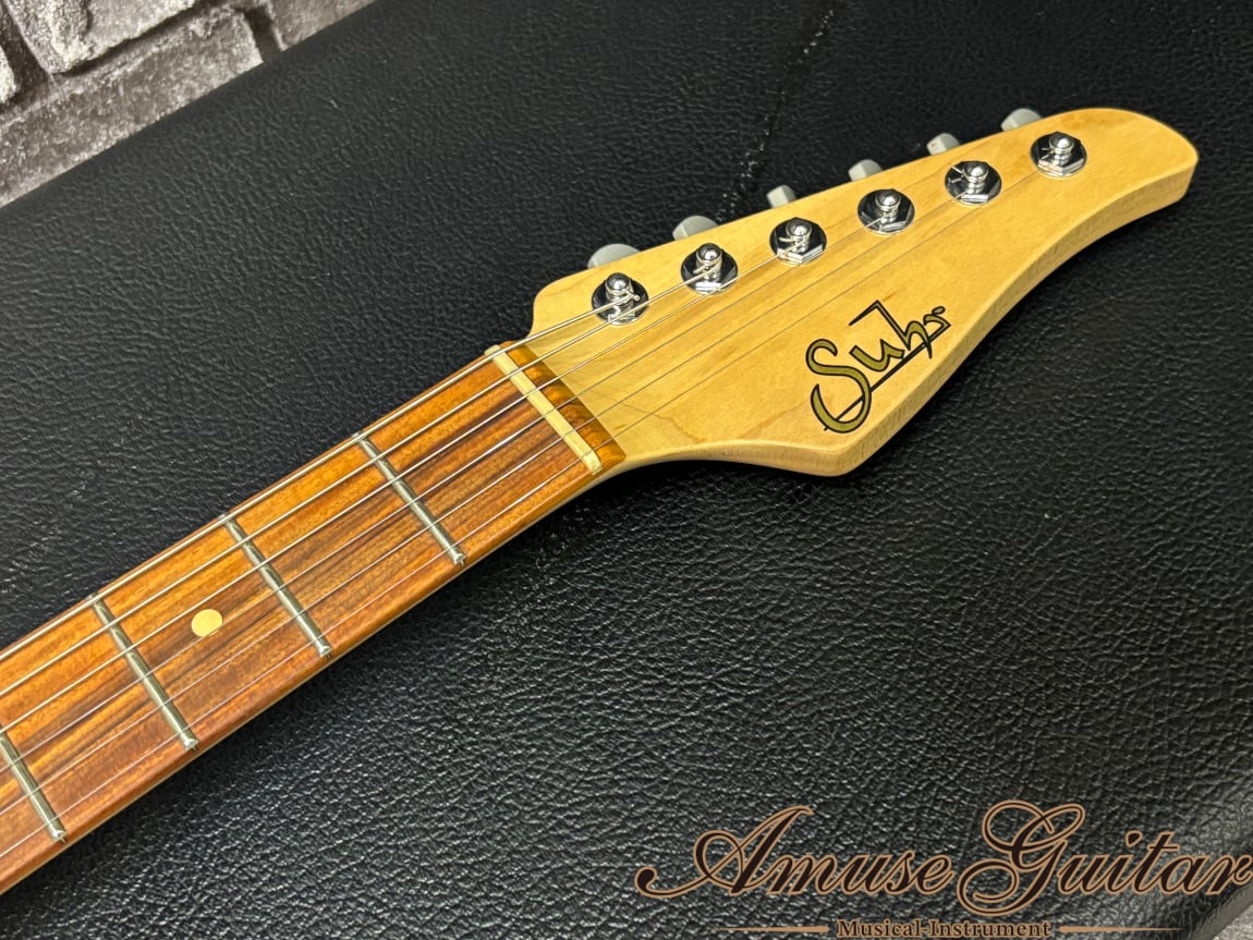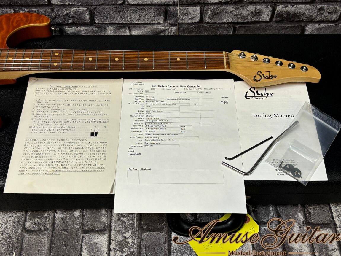 まずスペックとしては、ボディオプションである厳選された強烈過ぎるキルトメイプルをブックマッチ2Pにてボディトップに採用。グロス仕上げのハニーバーストとの組み合わせは、杢目のインパクト抜群ながらも落ち着いた雰囲気も併せ持つ抜群のルックスに仕上げられております。ボディバックには”サーと言えば”の良質なバスウッド材を採用したブラウンフィニッシュ。ネックには木目も強く、追い柾目の木取りとなる良質なメイプルを採用し、指板はサウンド面やタッチ感も素晴らしいパーフェローを採用しております。その他として、フレットはジムダンロップ6100のジャンボフレットの22F仕様。ネックシェイプは【Even C Slim .810-.900】&12Rのサー独特の心地よい握りを実現。チューナーはシュパーゼルロッキングチューナー、ブリッジにはGotoh 1099T(ソリッドサドル)、バズフェイトンシステム等の様々な特別なスペックが見受けられます。またネックポケット内には元Fenderのビルダーであり、Suhr GuitarsのMaster Luthier、”Kenny Gin”の製作者サイン、ヘッド裏にはJohn Suhrのサインが入れられております。