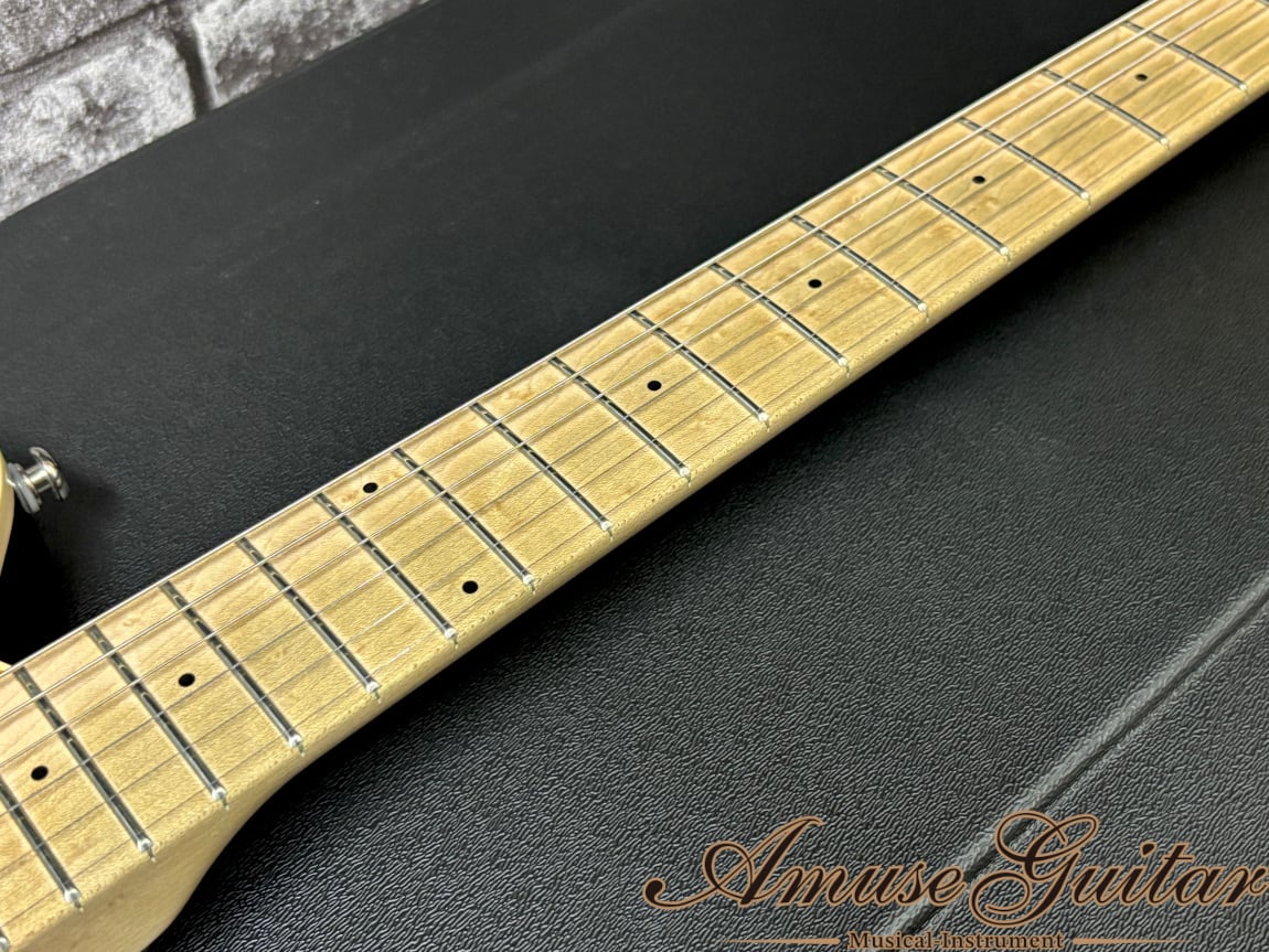 まずその仕様としましては、杢目の深いキルトメイプルトップに杢目を生かすグロス仕上げのゴールド(アンバー)。ボディバックにはバスウッド、ネックにはフレックラインも確認できる良質な材を使用した貼りメイプルネック、ヘッドはボディトップ同様のマッチングヘッドスタイル。22フレット(ミディアムジャンボ)、41mmナット、10R、ロングスケールの5点止めボルトオン構造。その他としてはブラスブロックのフロイドローズトレモロ(MUSIC MANオリジナル)&ロックナット、1ヴォリュームのコントロール(ノブはTONE)、シャーラーペグチューナー&パールボタン、独自のヒールレス加工、バックコンター加工などが挙げられます。