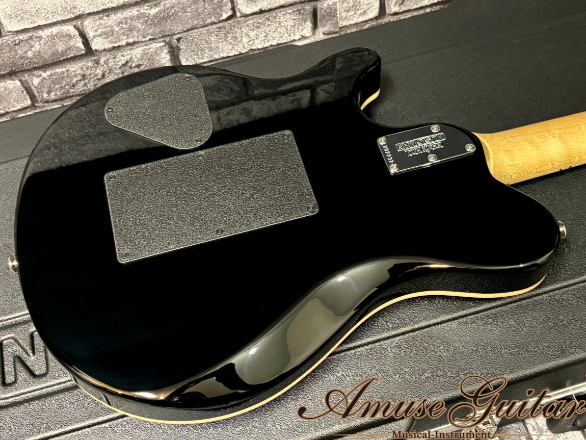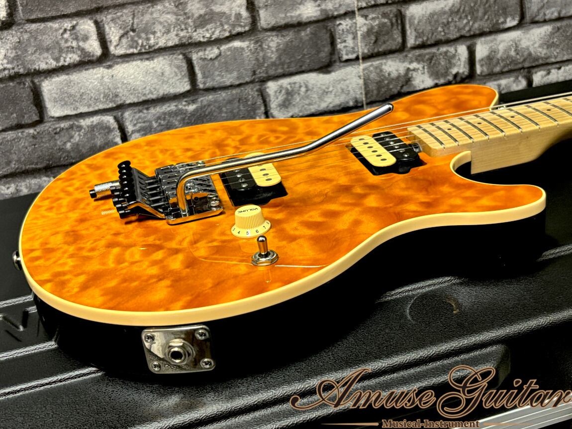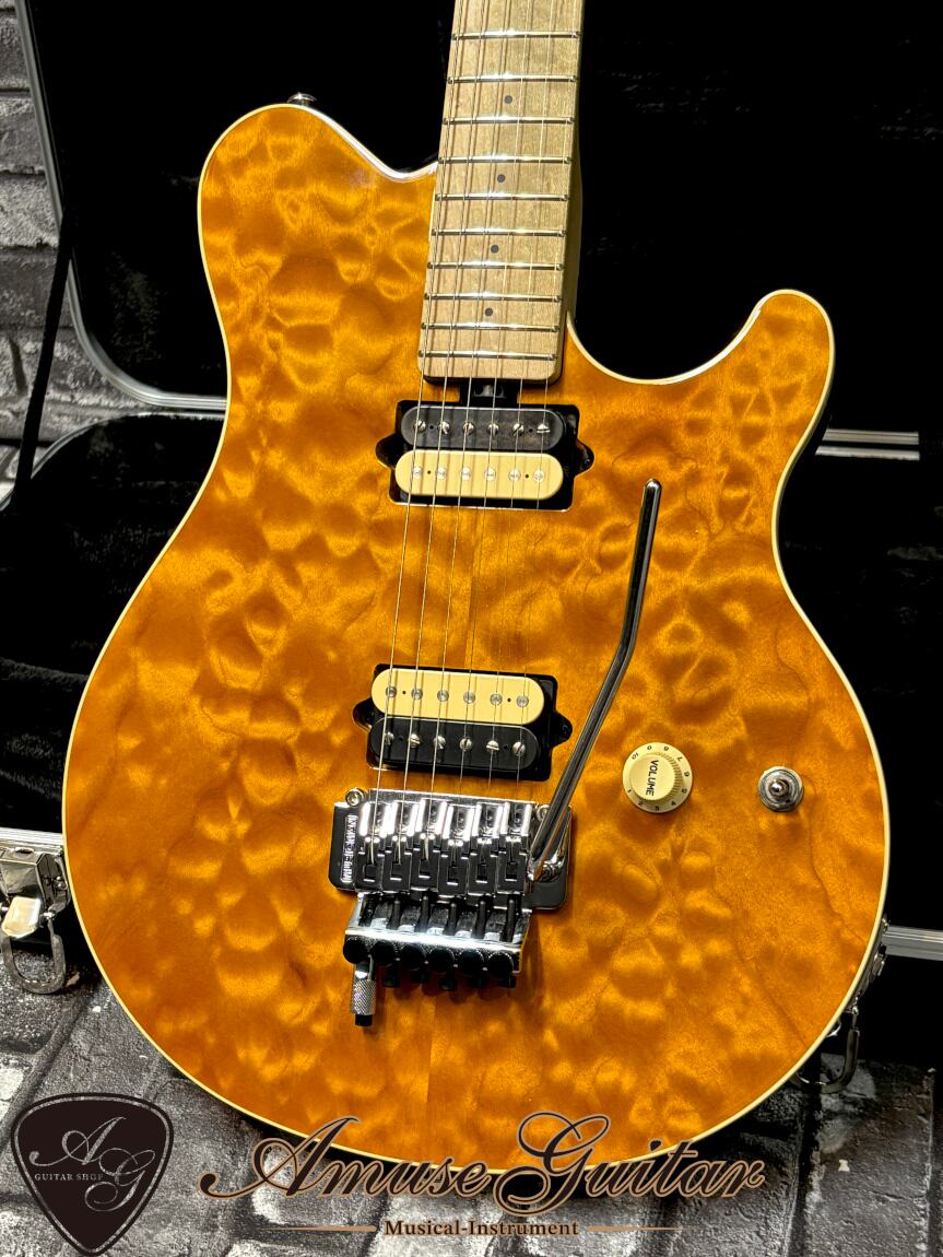 今回ご紹介させていただきますのは、そのミュージックマン社定番であるAXIS。Eddie Van Halenシグネイチャーモデルの Music Man EVHの販売終了後、その後継機としてリリースされたAXIS。その独自の使用感やサウンドが今なお広く愛されております。本機はその独自のサウンドレンジは勿論、ボディトップの大ぶりで深いキルテッドメイプルのフィギュアド杢目が抜群の個体です。更には前オーナー様によるD-tuner取り付けのアップグレードカスタマイズも施された究極の一本です。