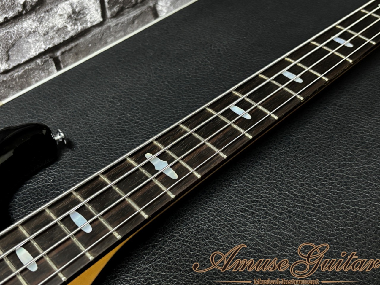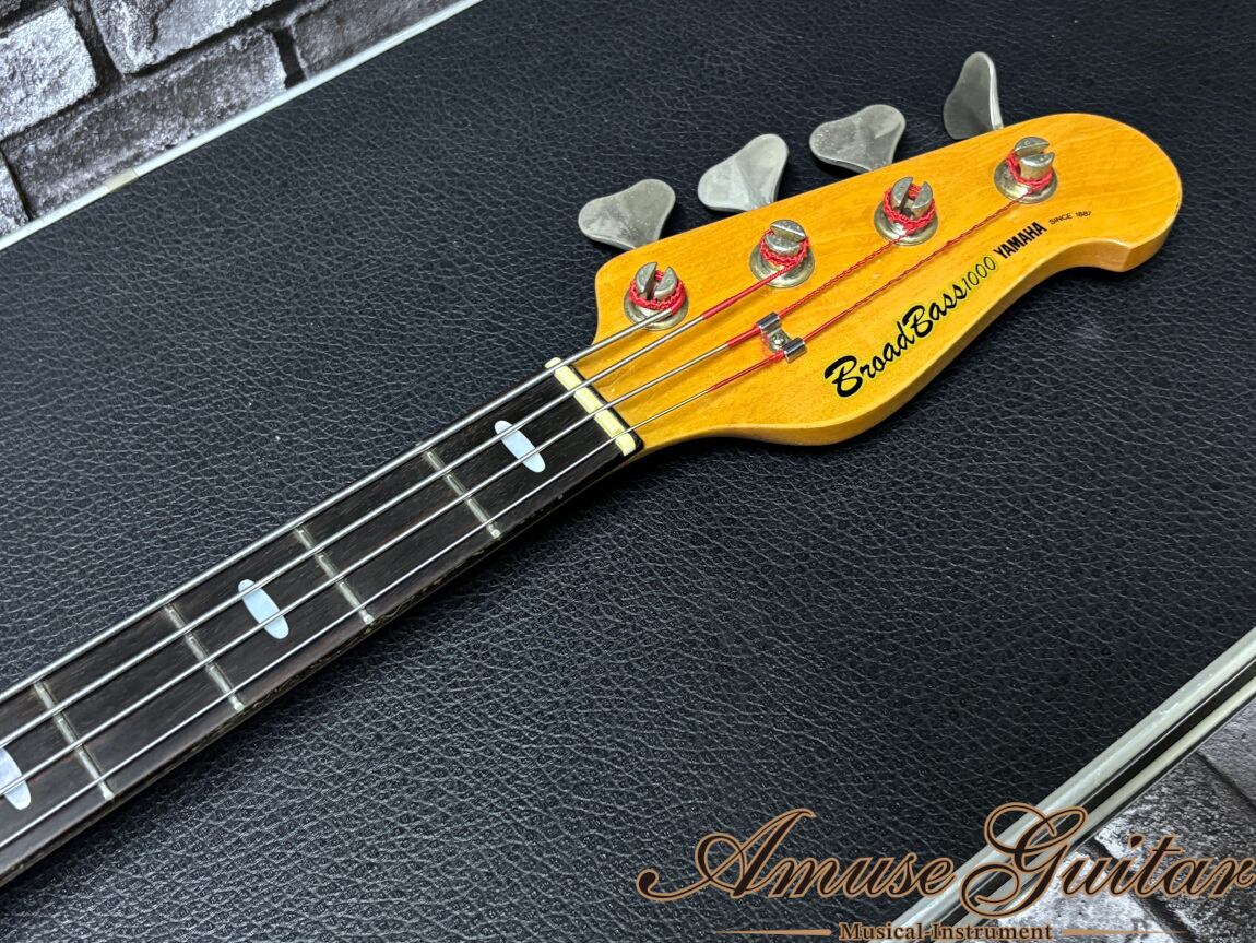 こちらのスペックですが、ボディにはアルダー(3P)、ネックにはフレックライン&フィギュアド杢目も確認できる上質なシーズニングされたメイプル、指板には当時のモデルでハイクラス品の証でもあるエボニーを採用した木材マテリアル。ロングスケール、約42mmナット幅、21フレット、細めのネックシェイプとなるボルトオン構造。その他、オリジナルYAMAHAペグ、波型ストリングガイド、【Broad Bass 1000 YAMAHA】のヘッドロゴ、ポジションマークは白蝶貝、YAMAHAロゴ入りジョイントプレート、ブラック3Pピックガード、スリット付きオリジナルノブによるコントロール(マスターヴォリューム/マスタートーン)、オリジナルのダイキャスト製ブリッジ等が挙げられます。