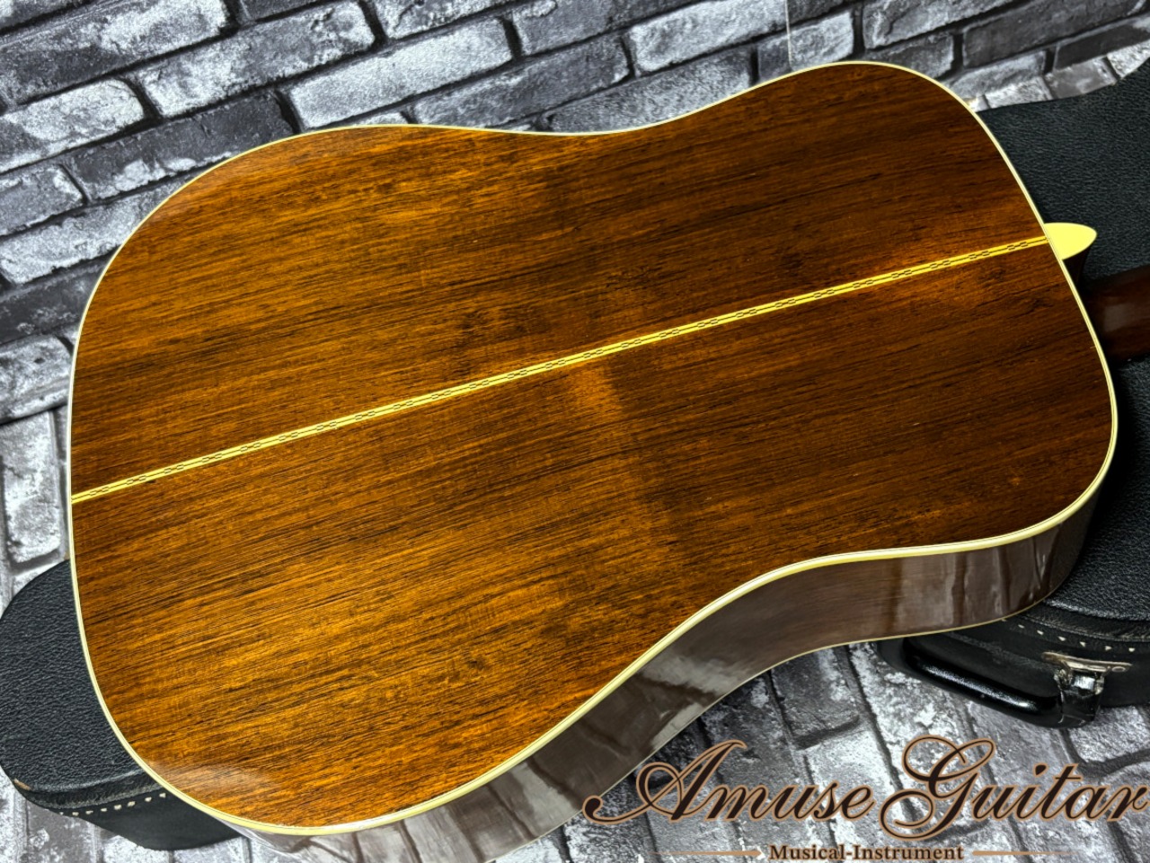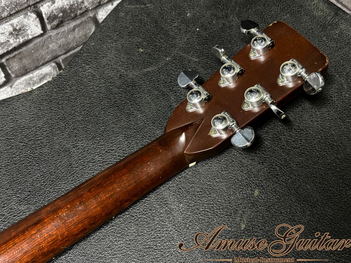 まずそのスペックとして、ボディトップはスプルース。サイド&バックにはワイルドかつ縦横無尽に走る黒の杢目が美しい極上のブラジリアンローズウッドが採用されます。ネックにはヴィンテージらしい良質なマホガニーネックに、エボニー指板。ダブテイルネックジョイント、14Fジョイントの20F仕様、ベリーブリッジにブラックピックガード、Pat.Pend刻印のグローバーチューナー(1ドット102)、マザーオブパールのドットインレイ、ヘッドの突板もボディ同様のブラジリアンローズウッドが採用されております。