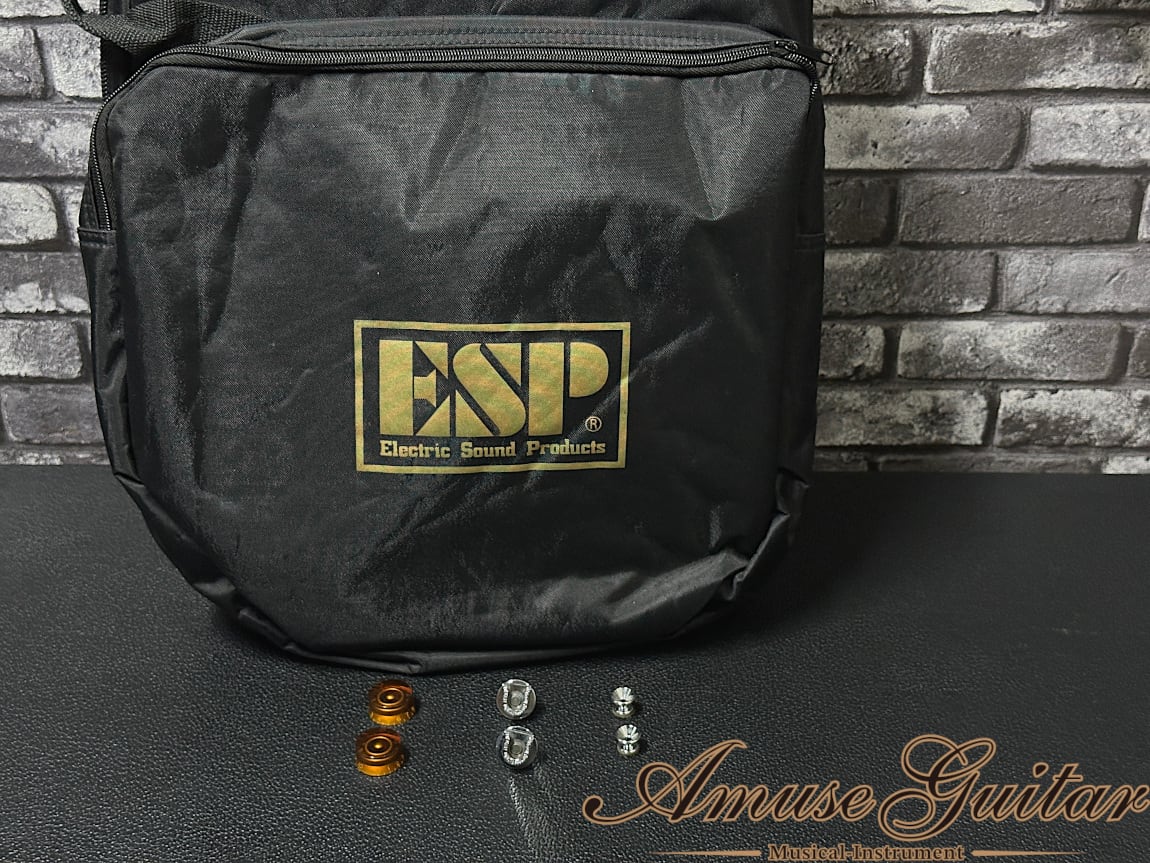 気になる状態ですが、細かなスレ、浅めの打痕、ヘッドバックにペグを一度交換した際の埋め木がございますが、リペア跡もシッカリと補修され、加えて目立つダメージ箇所も無く、製作から約20年経過しているとは全く思えないかなり綺麗な状態です。ネック状態も非常に良好でフレットは7~8割残り。トラスロッドの余裕もシッカリと確認済みです。付属品は換装元パーツ(ノブ、ストラップピン)、ストラップアタッチメント、オリジナルESP GIG CASEです。※画像のハードケースは撮影用の物となります。