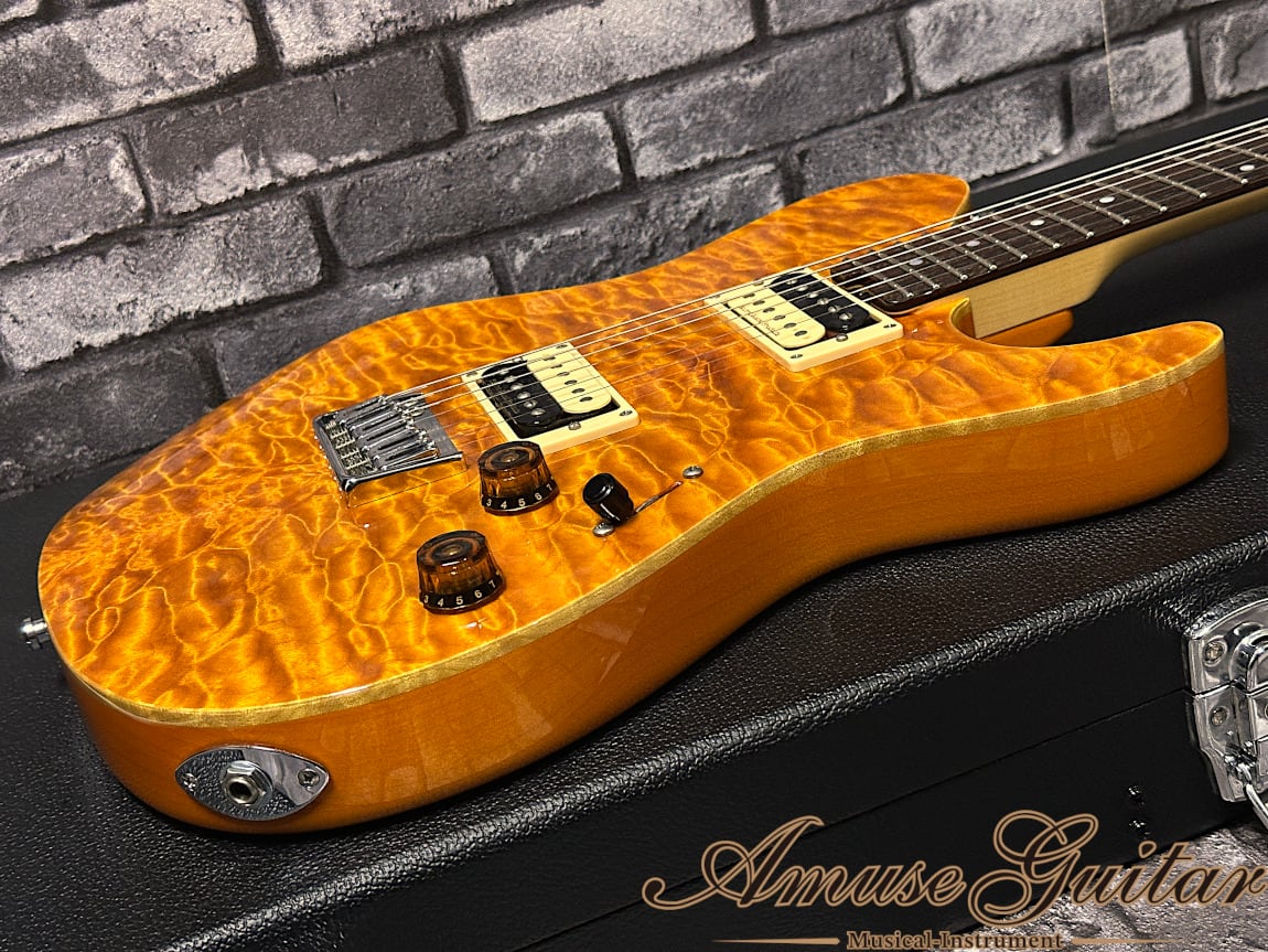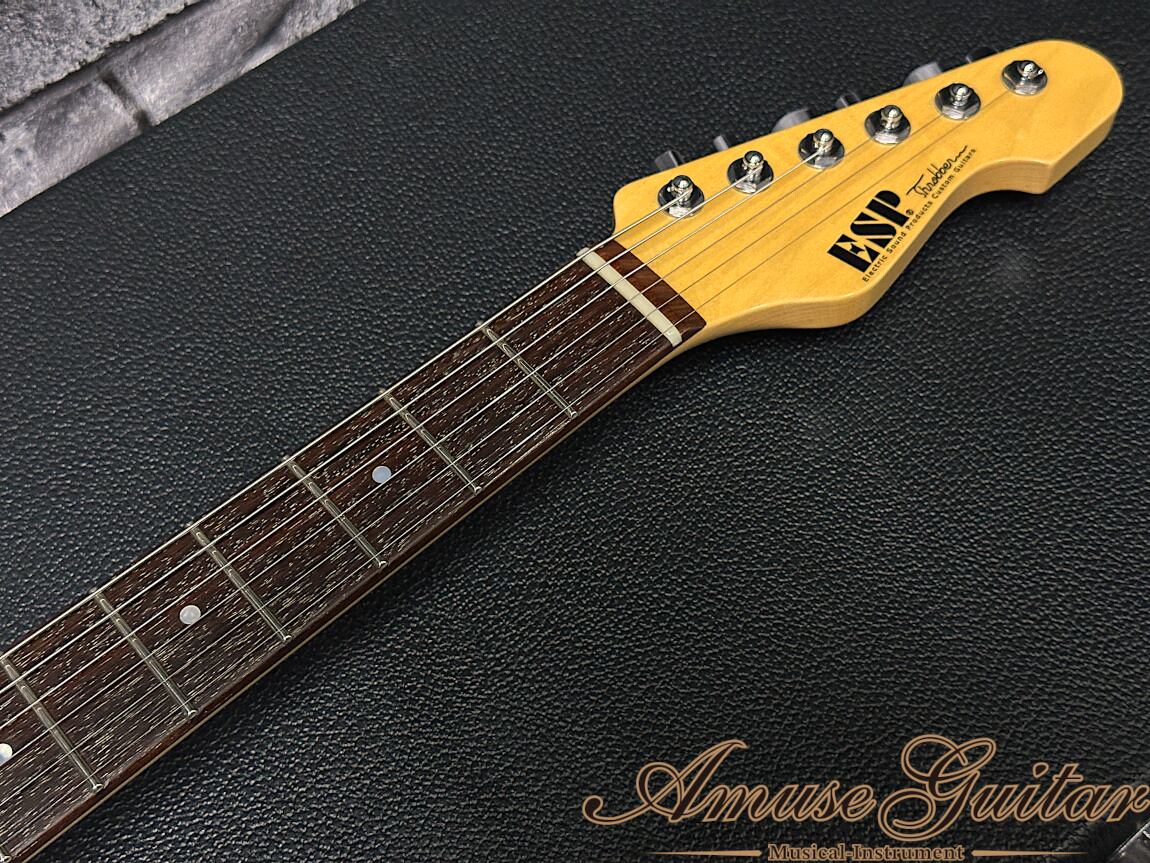 こちらのスペックですが、ボディにはトップに極上杢目のキルテッドメイプル、ボディバックはアルダー。ネックには追い柾目の木取りとなるメイプルネックに、まるでハカランダの様なブラウンの濃いスラブ貼りのローズウッド指板を採用した木材マテリアルです。ロングスケール、22フレット、42mmナット幅、240-305Rのコンパウンドラジアス、ローポジションはソフトV→ハイフレットに向かうにつれUになる細めの”V to U”シェイプネックのボルトオン構造。ボディトップ塗装はヴィンテージライクなアンバーカラーのグロス仕上げとなり、バーストと呼ばれるレスポールや、MUSICMANのAXISを彷彿とさせる様な杢目を生かす至高のカラーチョイス。ブリッジはESP FIXED Bridge(削り出しブラスサドル)。ヘッドにわずかな角度をつけたCT SYSTEMと、ペグポスト高さの異なるSperzelロックペグによりストリングガイドを用いらず弦を張ることが可能で、鳴りとチューニング精度の向上に一役買っています。その他としましては、ボディの一部を斜めにカットするスターカット採用にてハイポジションの演奏も容易に。ストラップピンはシャーラーロックに換装されています。