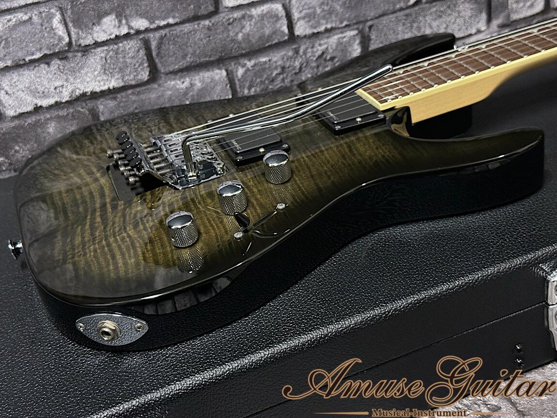 こちらのスペックはフレイムメイプルトップにバスウッドバックのボディ。メイプルネックにローズウッド指板を採用した木材マテリアル。ロングスケール、43mmナット幅、リバースヘッド、24フレットのボルトオン構造。その他としましては、指板にピラニアインレイ、各部コンター、各PUヴォリュームと、マスターボリューム、3wayピックアップセレクターのコントロール、ロック式トレモロ(TPS-101)も搭載で激しいアーミングも勿論可能です。