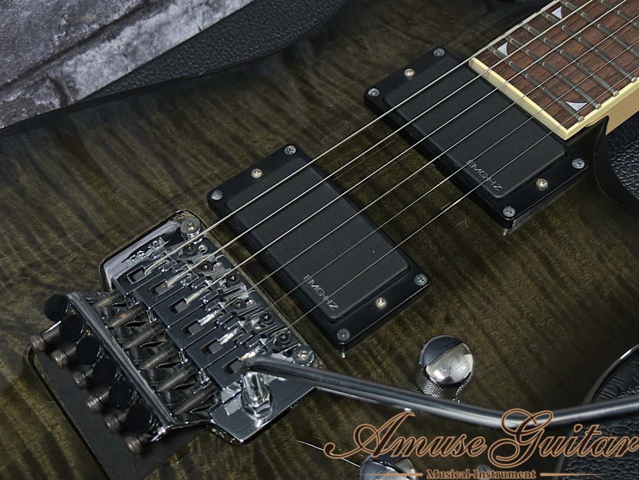 サウンドの要となるピックアップには、EMG-HZ(H4)がフロント、リア共に搭載。パッシブ構造となる電池を用いないこちら、EMG社らしいHR/HMにベストマッチングした押し出しのあるパワフルさはもちろん、コードの分離感や、輪郭の整った音像が扱いやすいサウンドとなっております。激しく歪ませた際のサスティーンも心地よく、サウンドレンジも広いので幅広いプレイヤーに愛される仕上がりとなります。