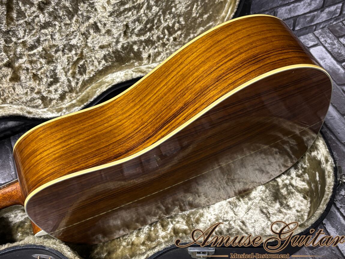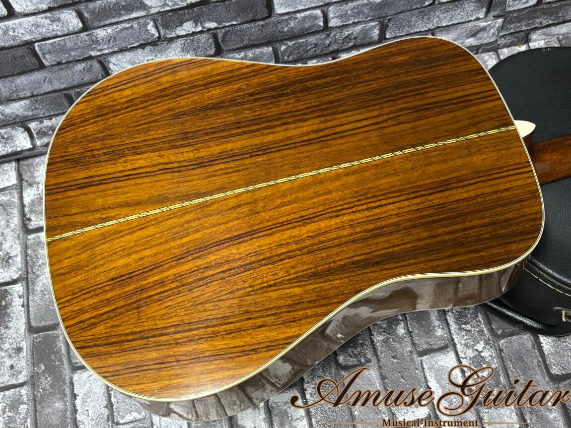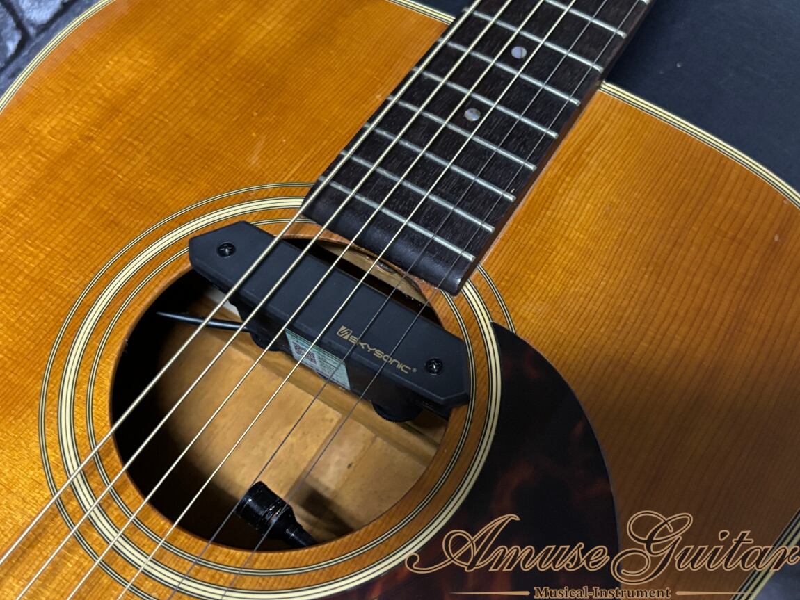肝心のサウンドは、30年以上の時を経たことにより、倍音と空気感が非常に豊かで、太く芯のある低域、押し出しのある中域、そしてスッと伸びるような高域が絶妙なバランスで調和しています。フィンガーピッキングではニュアンスが細やかに表出し、ストロークでは豊かな音圧が広がり、ジャンルを問わず幅広いスタイルに対応できる包容力を備えています。さらに本器には、後付けでSKYSONIC製のNEW T-902 2WAYピックアップシステムをインストール。マグネティックPUとコンデンサーマイクをブレンドすることにより、生鳴りの空気感をそのままライン出力に落とし込むことが可能です。ライブや録音環境においても極めて自然な音像が得られ、ステージでも即戦力としてお使いいただけます。