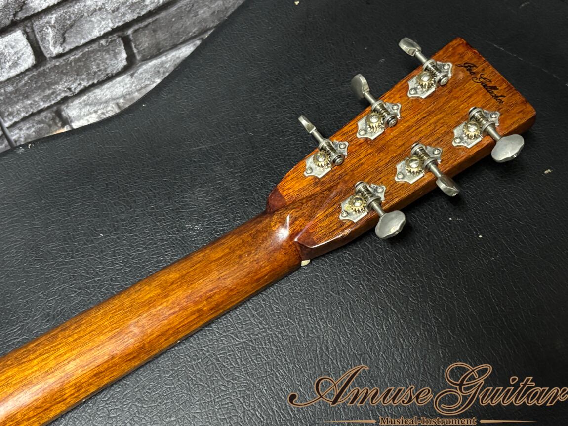今回ご紹介させて頂く本器は1991年製のドレッドノート・スタイルの1本。クラシックなD-28タイプを踏襲しつつも、ギャラチャー氏ならではの抑制の効いた装飾と、木材の質感を活かしたシンプルな美しさが際立ちます。ボディトップには、細かなフィギュアド杢目も確認できる上質なスプルース材を採用。サイド&バックには豊かな倍音と奥行きをもたらすローズウッド、ネックにはマホガニー、指板とブリッジにもローズウッドが使用されています。いずれも伝統に忠実でありながら、ハンドクラフトならではの選別と仕上げが感じられるマテリアル構成です。セットネック構造、14フレットジョイント、20フレット仕様、ナット幅は約42mm、スケールは約650mmと、王道のドレッドノートスタイルをベースにしていますが、現行の大量生産モデルにはない柔らかさと精密さを両立したネックシェイプも魅力。年月を経て乾いた木材がもたらす抜群の鳴りと共に、プレイヤビリティの高さも両立した一本となっております。