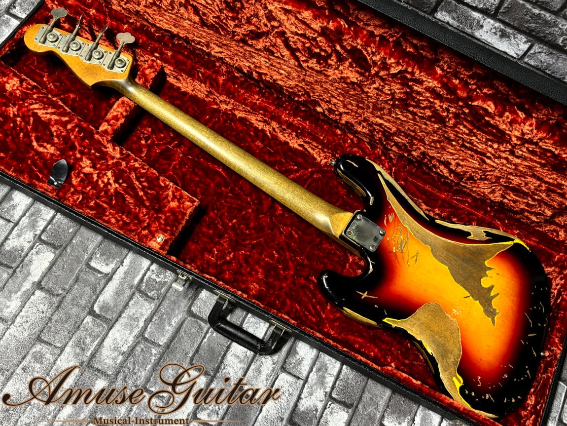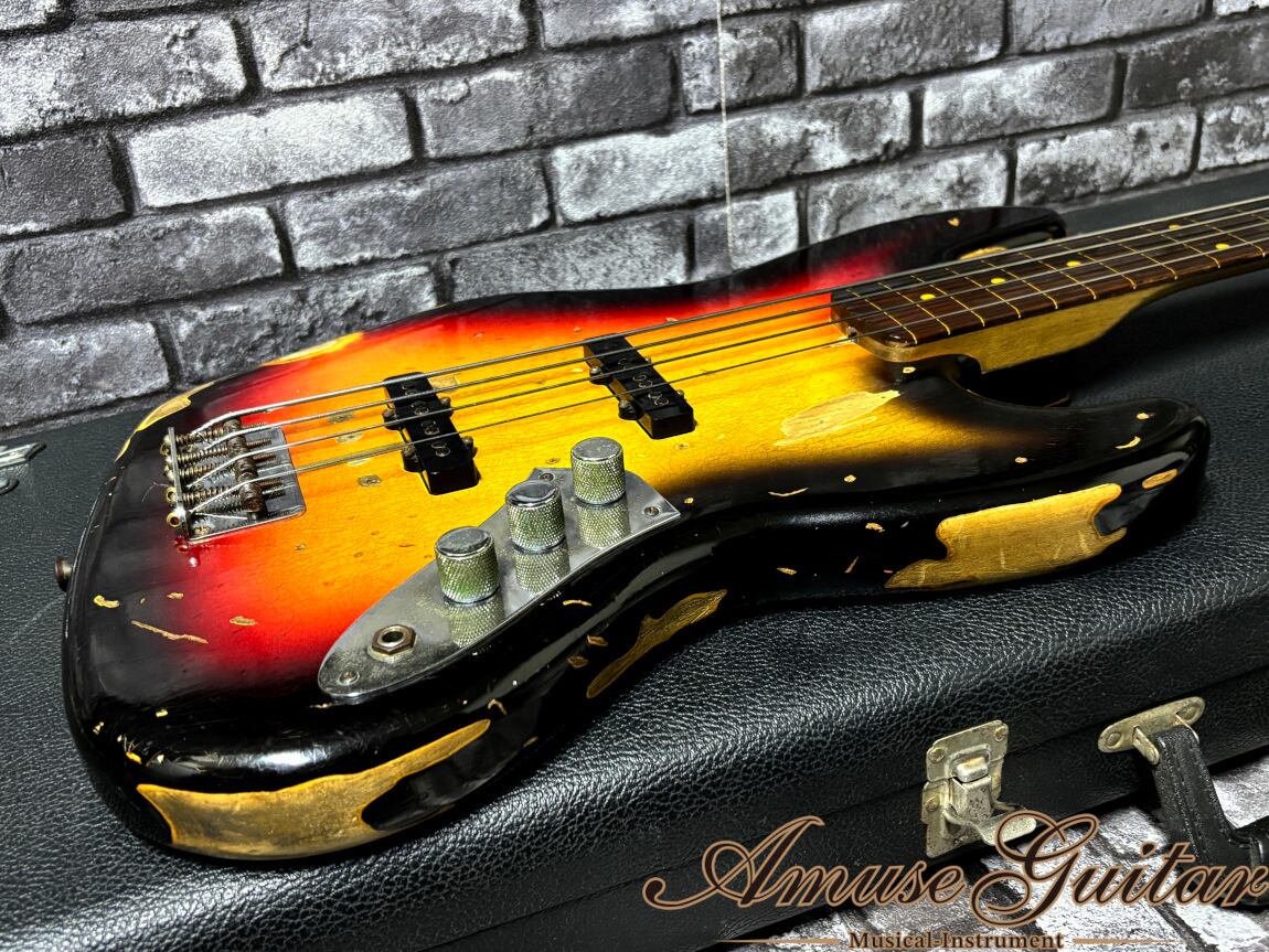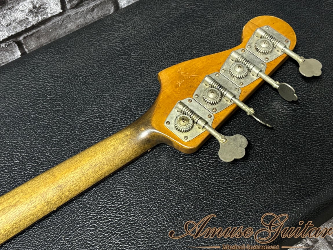 今回ご紹介させていただきますのは、その伝説の” Bass of Doom”をフェンダーが細部まで再現した渾身の一本です。フェンダーのレギュラーラインとカスタムショップ製が存在しますが、こちらは上位機種となるカスタムショップ製。尚且つ1999年にリリース開始されたこちらですが、その製作初期となる2000年製で、鳴りや木材のクオリティを見ても気合の入っている事が感じられる良質な個体です。ネック&ボディやパーツに至る細部まで、現在のFenderでいうところのSuper Heavy Relic~Ultimate Relic一歩手前の圧巻のエイジング加工が施されており、その存在感抜群のルックスも魅力の一つです。