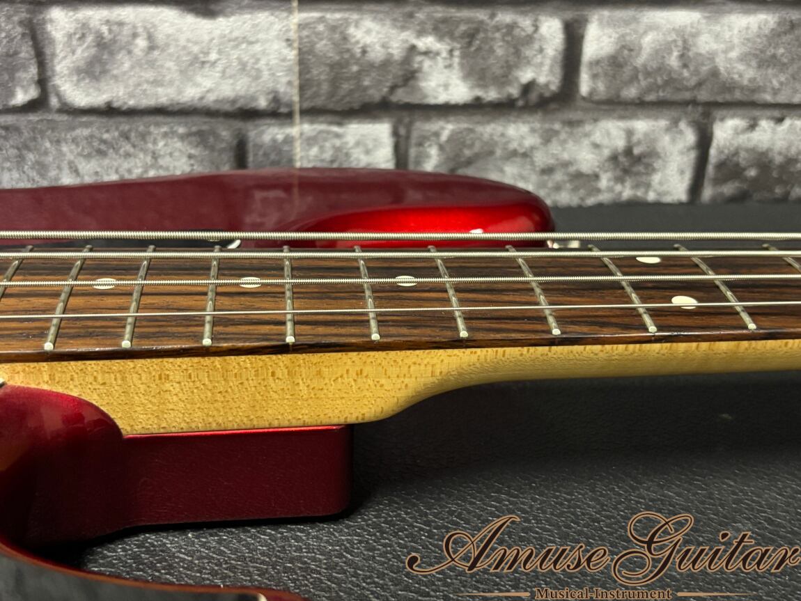 こちらのスペックとしましては、メイプルネック、今や希少材として入手困難になってしまったローズウッドを指板に、ボディにはレンジが広く、ハイエンドブランドでも多用されるバスウッドを使用した木材マテリアルとなっております。ペグにはオープンギアのクローバー型・順巻きペグ。その他としては、ボディにグロス仕上げの塗装、ネックにはサラサラとしたサテン塗装仕上げ、トラス調整穴がヘッド側となっておりネックを外さなくてもトラスロッド調整が可能となる仕様、ブラック3Pピックガード(換装)や、円盤型ストリングガイド、4コマサドルブリッジ等の特徴が挙げられます。