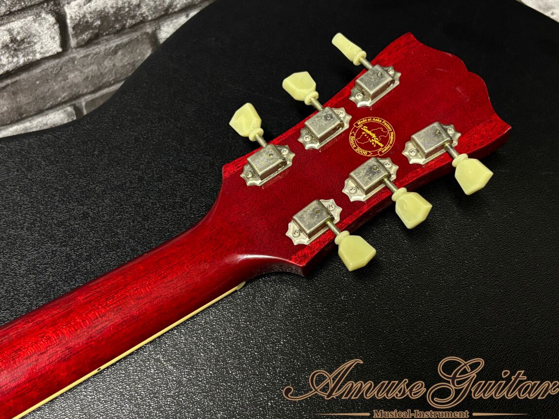 こちらのスペックですが、メイプルのラミネートのボディ(センターブロックもメイプル)に、ネックは1Pアフリカンマホガニー、指板にはインディアンローズウッドを採用した木材マテリアル。624スケール、43mm(ボーン)ナット、22フレット、310Rのセットネック構造。トップにラッカーを採用した塗装は、艶感でも高級感を引き立てます。その他としましてはオリジナルヘッドシェイプ、ヘッド裏には飛鳥工房にて製作されたことが分かるエンブレムロゴ、クルーソンタイプペグ、トラスロッドカバーにはStandardの刻印、ドットポジションインレイ、指板/ボディトップ&バックにバインディング、ノンワイヤーチューンOマチック&ストップテイルピース(アルミ)ブリッジ等が挙げられます。