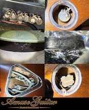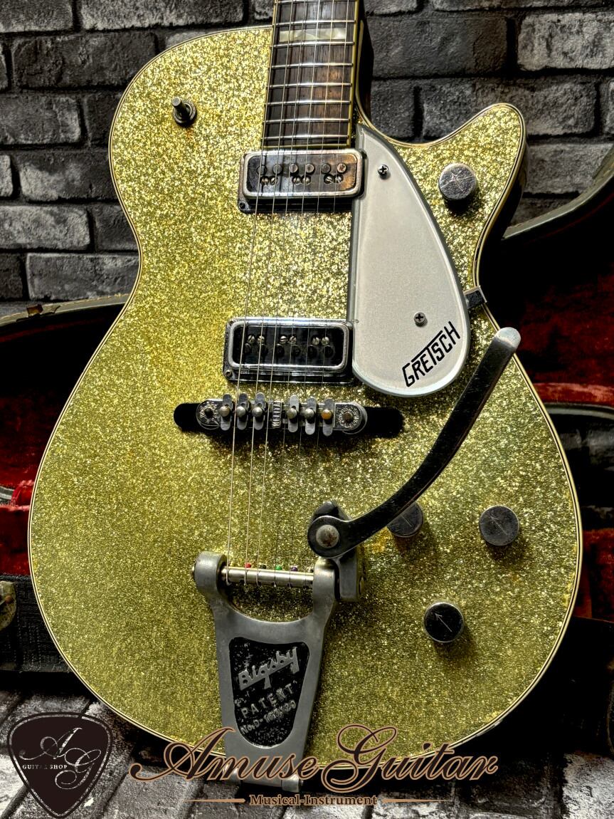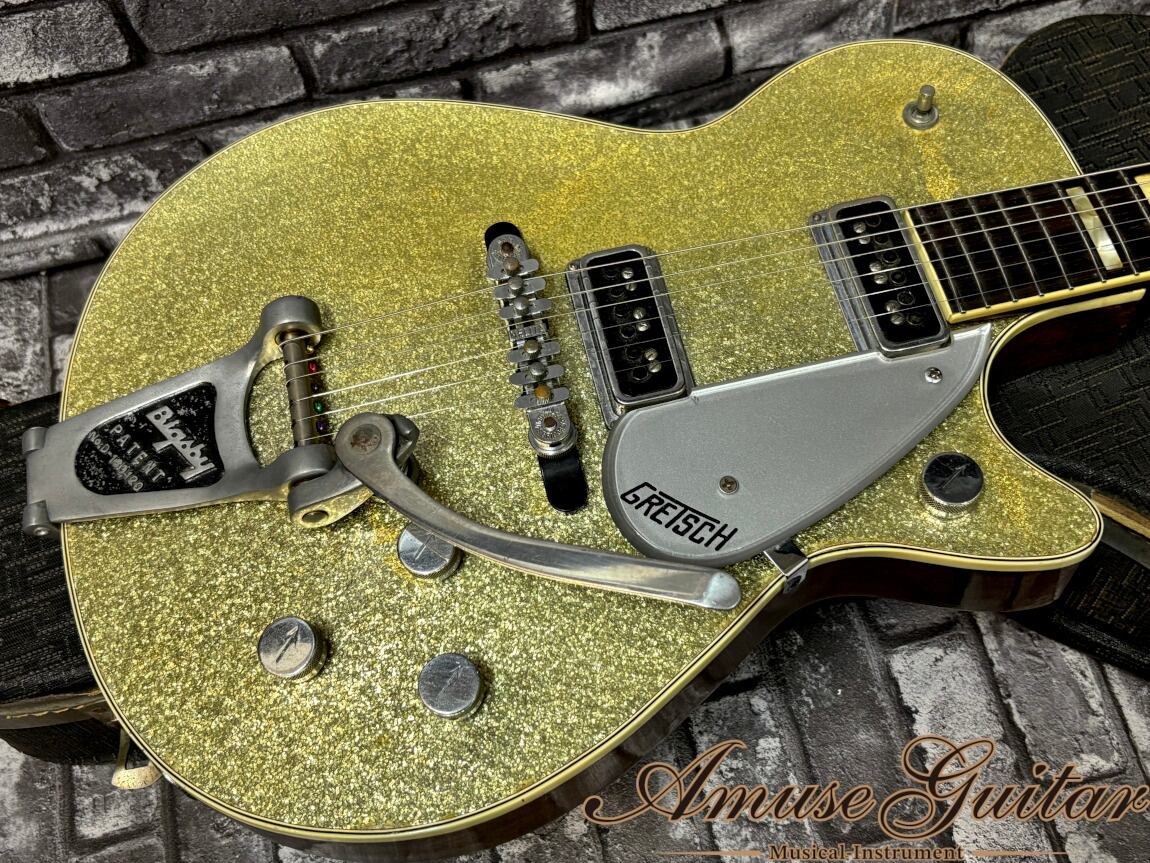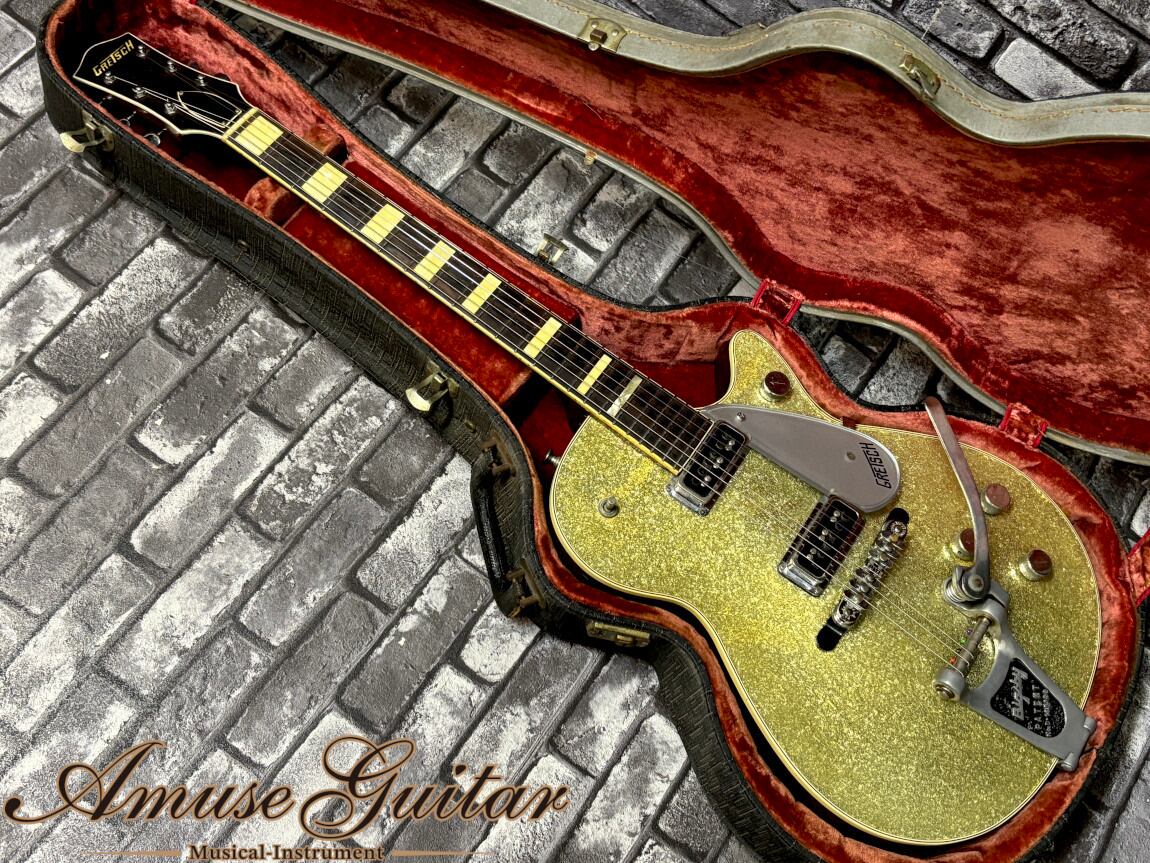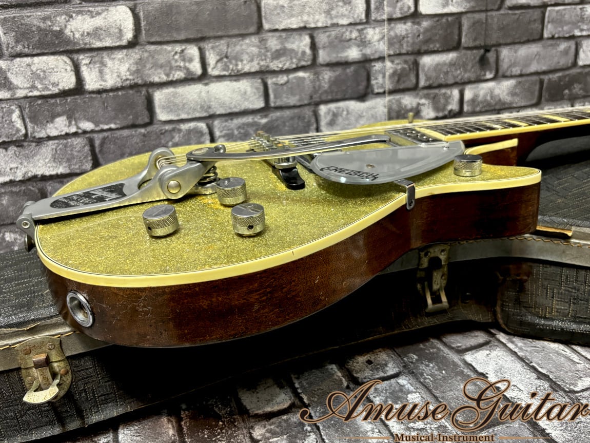 状態ですが、打痕やスレが見受けられるものの、69年前の一本という事を考慮すれば非常にキレイなコンディションをキープ。その他バインディングの僅かな浮き等の補修、ペグの交換歴(オリジナル→クルーソン→オリジナル)の跡、17フレット部のブロックインレイ交換、パーツ交換(リフレット/リナット、ストラップ)を確認。オリジナル度も高く、ネック折れ等の木部補修や激しいダメージは無しで、演奏面にも問題のある個所はございません。ビグスビーユニットですが、ユニット下にテイルピース取り付け用の下穴はございますが、ユニット自体の自然経年に加え、塗装焼け跡や塗装/木部痩せ等からオリジナルの可能性も残したものとなります。(ビグスビーユニットは当時のオプション)ボディ内部のラベルに関してはモデル名の部分に【6128】(※Duo Jetのモデルナンバー)とスタンプされた上に青いインクにて修正されている事が確認できますが、この青いインクにて同年代のグレッチ製品ラベルを記載している履歴等が見受けられる事と、塗装もオリジナルのシルバースパークルとなり、リフィニッシュ個体でないことから製造出荷時からのものと推測されます。その他ネックについても、トラスロッドの余裕確認済み。フレットはナロートールのステンレスとなり、減りは感じられません。付属品はオリジナルとなるヴィンテージグレッチハードケース(トーレックス剥がれ等の経年有り)となります。