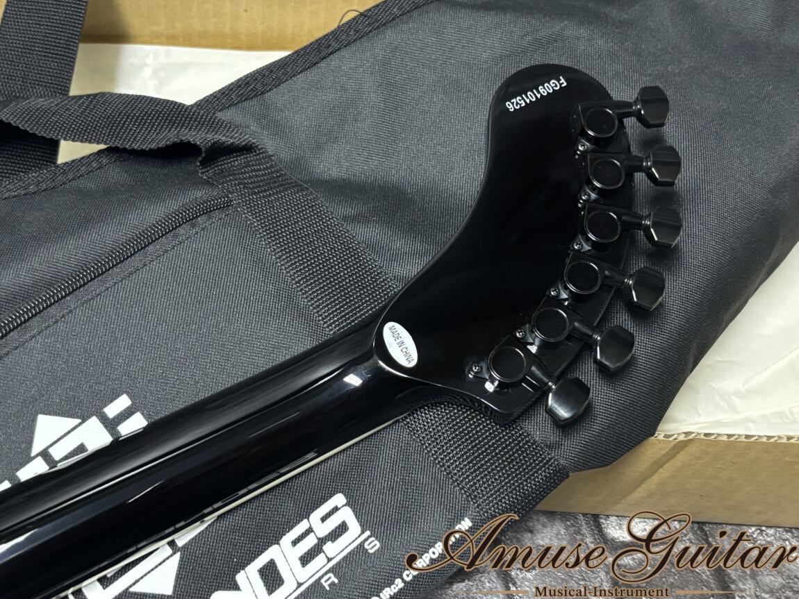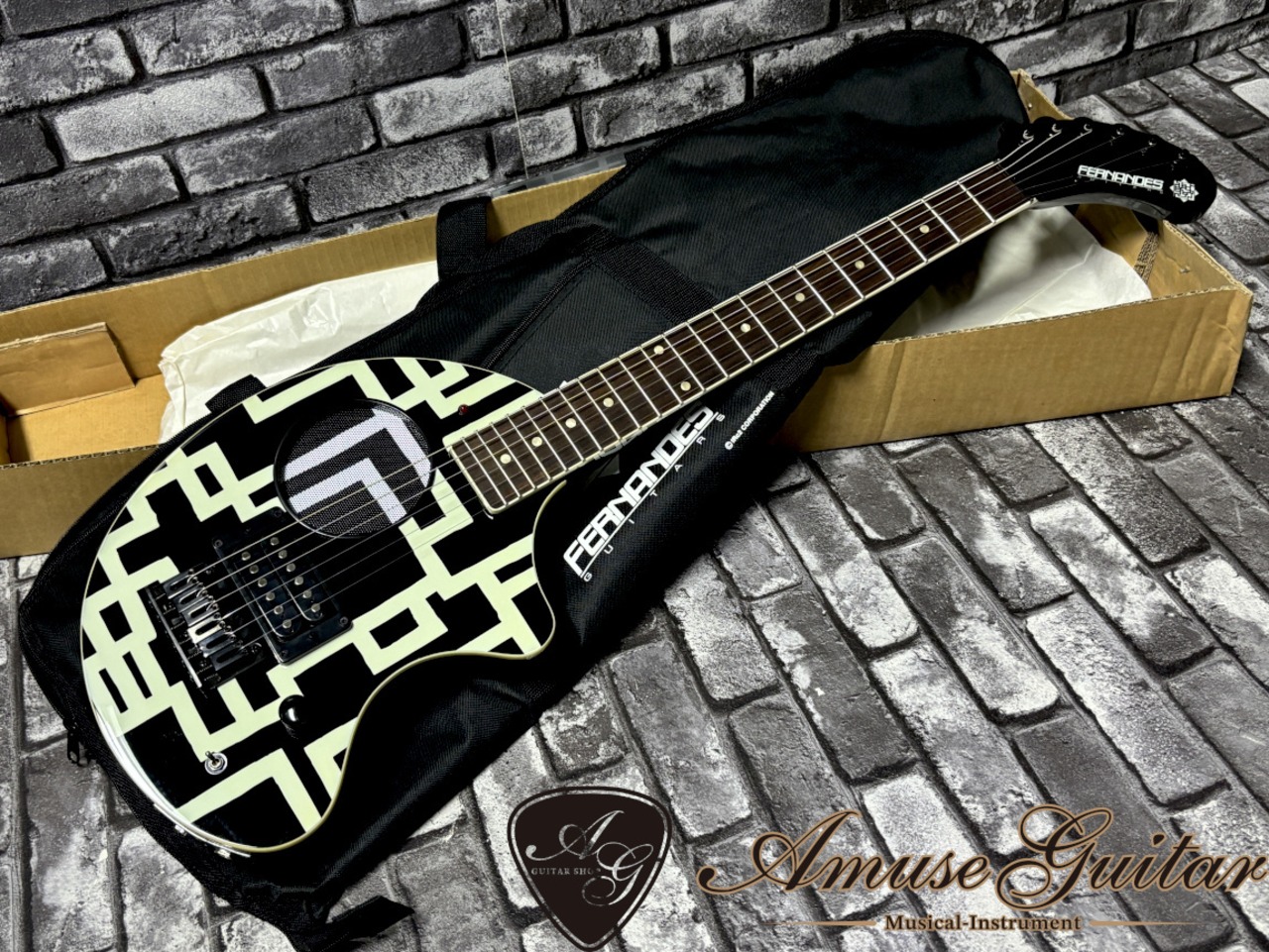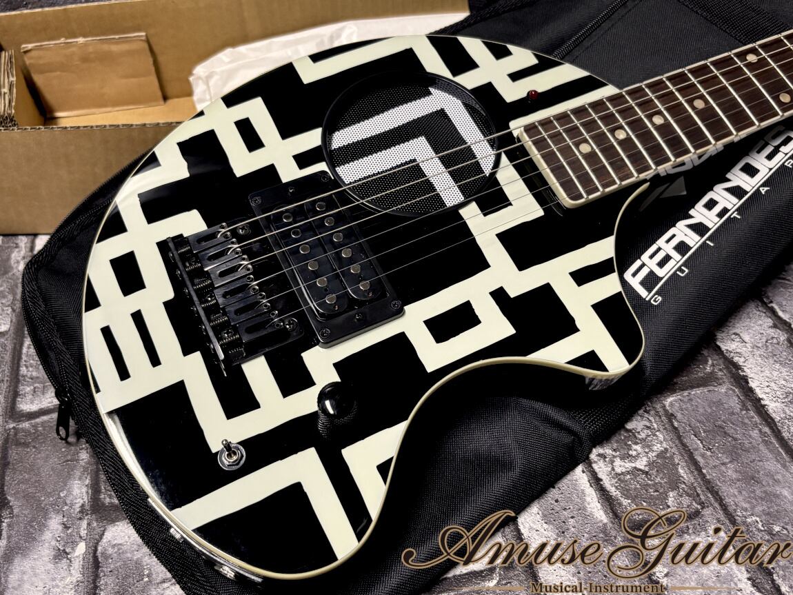 今回ご紹介させていただきますのは、日本を代表するギタリスト布袋寅泰氏にまつわる激レアアイテムの逸品。長年布袋氏とのタッグを組み続けていたギターブランドのFERNANDES社を代表するアンプ内蔵ミニギター”ZO-3”とのコラボ品。2009年【GUITARHYTHM V TOUR】のツアー会場物販ブースと、公式サイト通販のみで予約販売されたモデルで、布袋氏の代名詞である幾何学模様(通称”G柄”)がデザインされたルックスと、新開発サーキット採用による音質向上のスペックが注目を浴びました。609mmのショートスケール、22フレット、マスターヴォリューム、ミニスイッチ(パワーON/OFF)、アンプ用ジャック、ヘッドホン用ジャックとなるシンプルスペック。