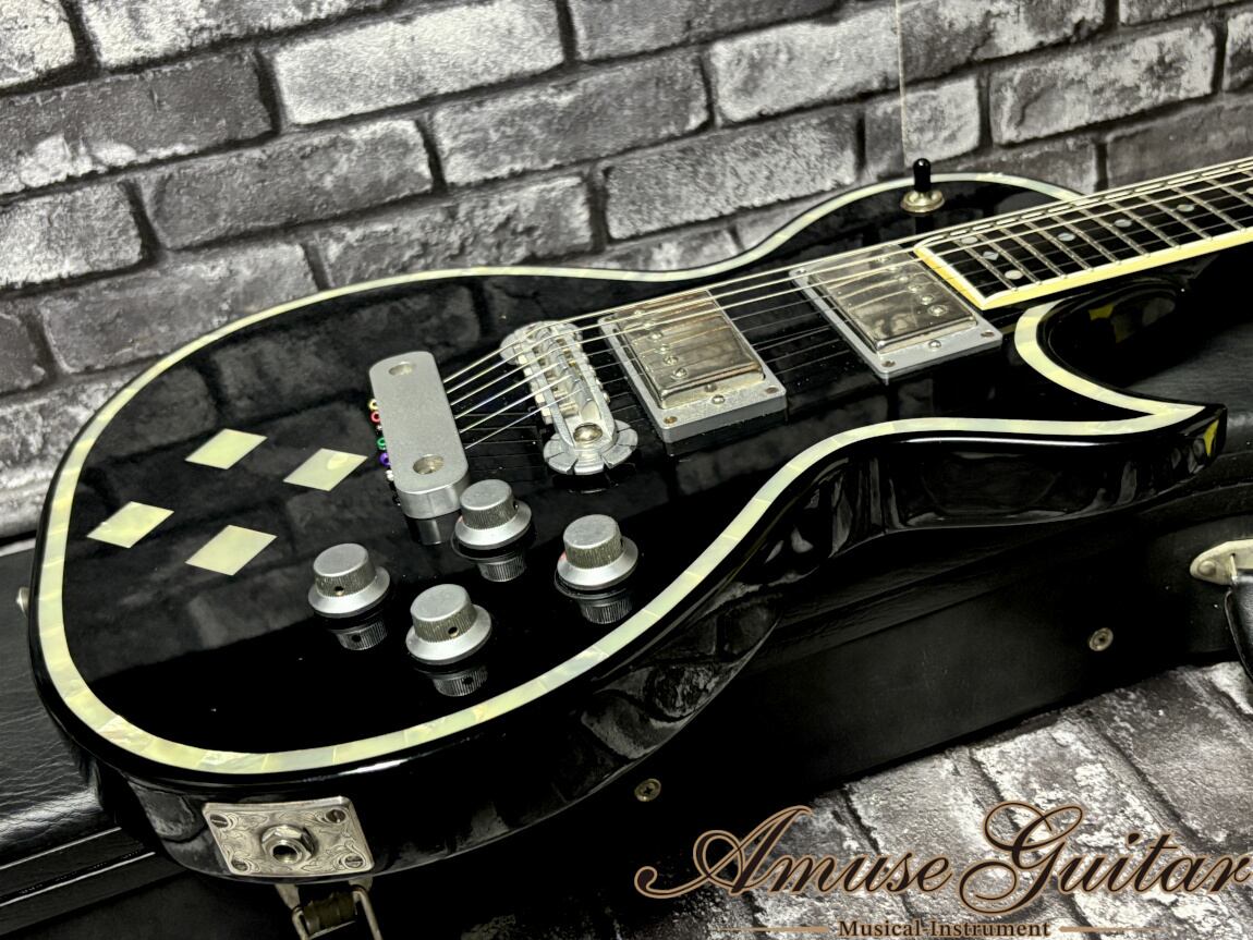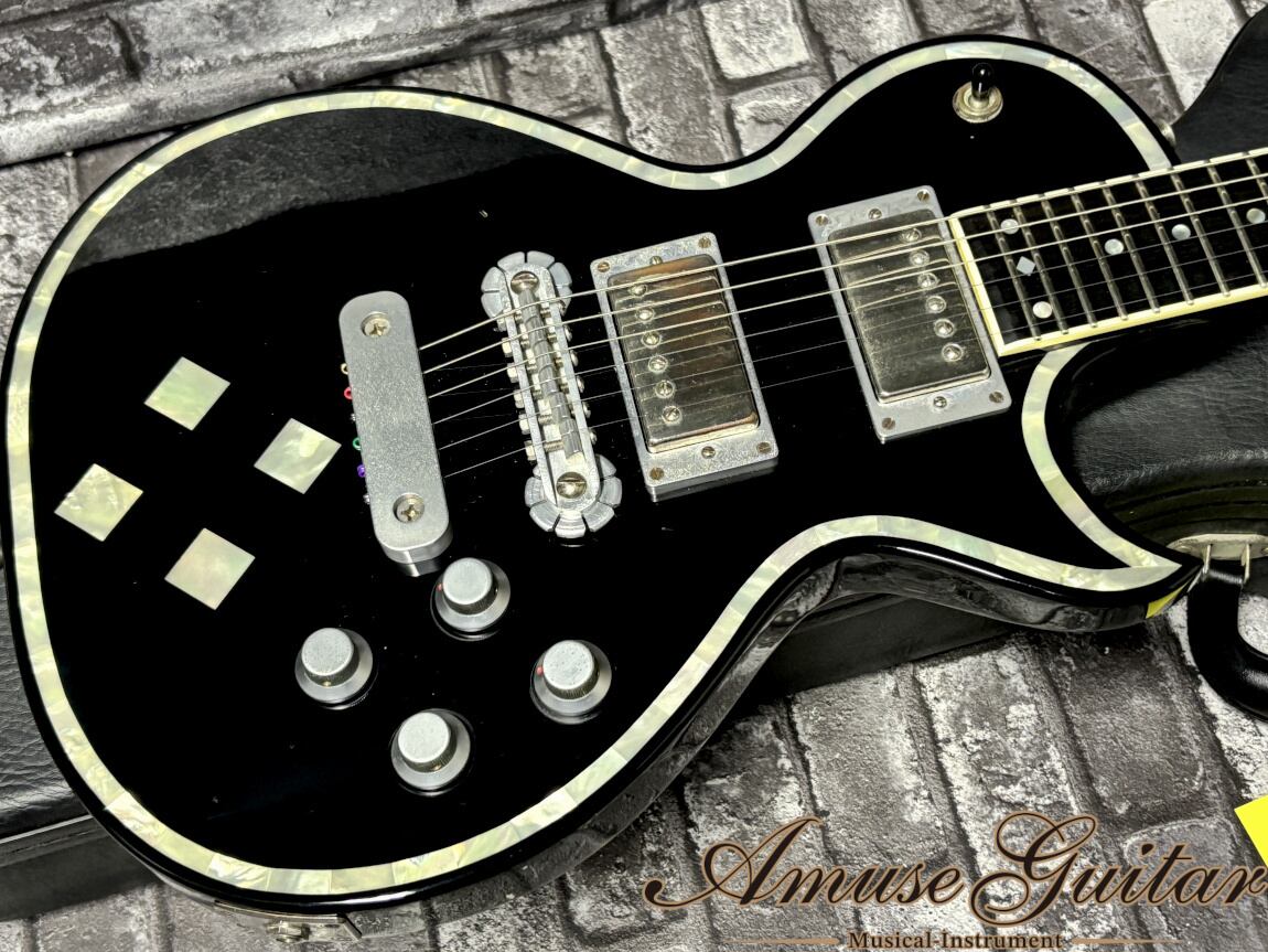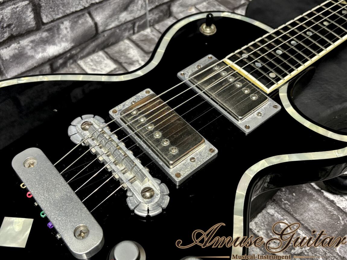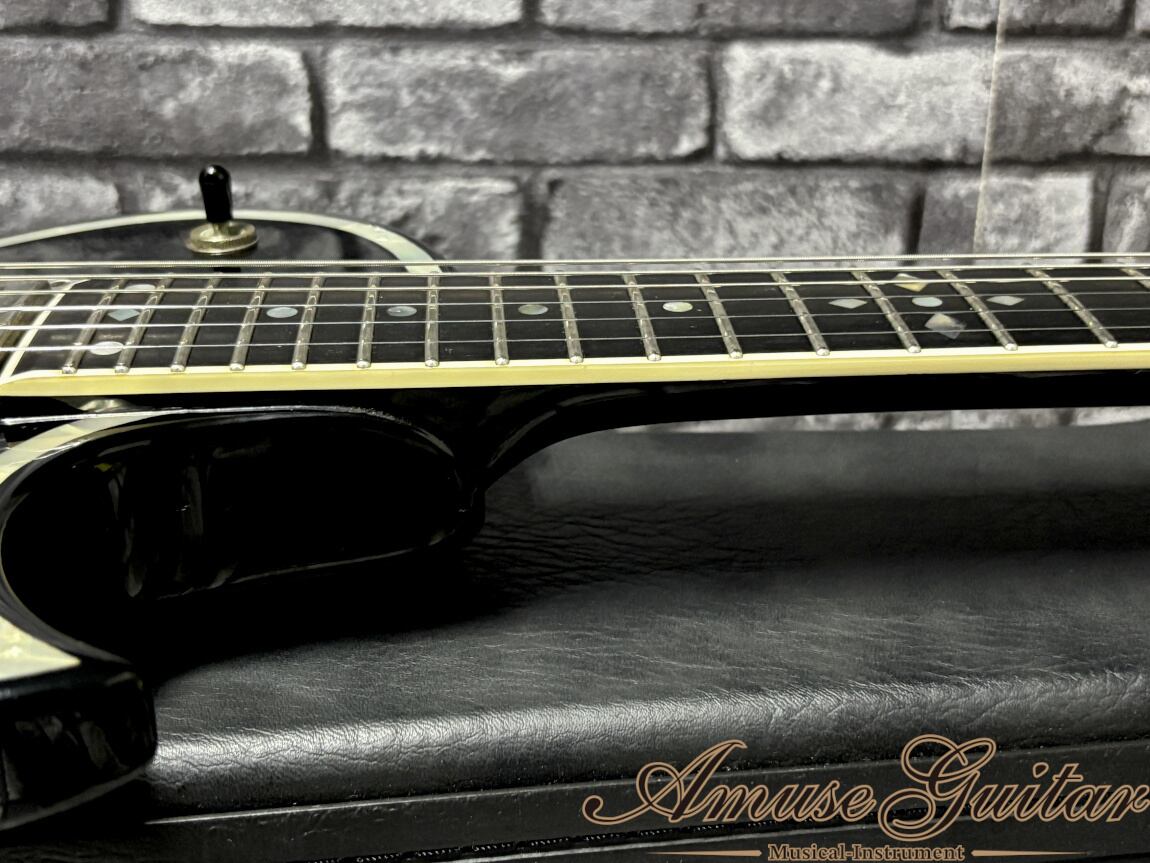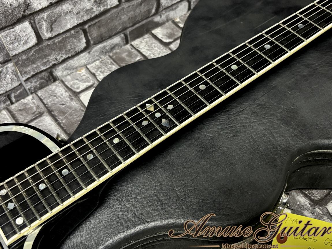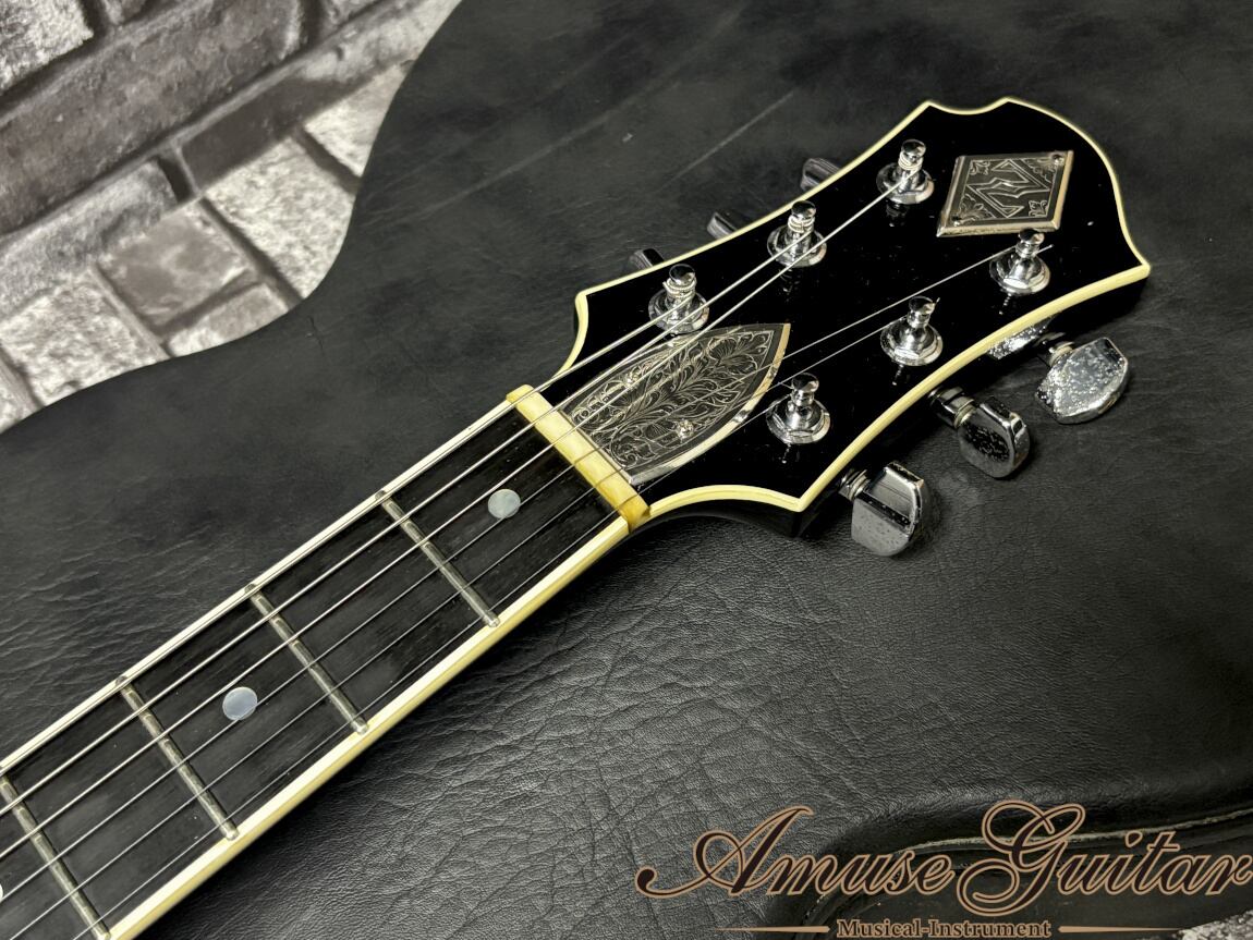こちら当時のグレコゼマティスの中で最上位機種だったことが頷ける豪華なスペックが採用されています。まずボディには1Pのマホガニー、ネックも1Pマホガニーに、漆黒ともいえる木目の詰まった色濃いエボニーの木材マテリアル。636mmスケール、約43mmナット、12R、薄めのネックグリップ、24フレットのセットネック構造。約40mmのボディ厚は非常に取り回しがよく、そのボディの外周に沿った部分と、テイルピース下部にソリッドのマザーオブパール(白蝶貝)のインレイ装飾が高級感を際立たせます。その他としましては、ヘッドトップのロゴ&トラスカバーに彫刻、シャーラーペグ、マザーオブパールの指板インレイ、オリジナルのジュラルミン製エスカッション/ブリッジ/テイルピース、オリジナルノブ、彫刻入りジャックプレート等が特徴として挙げられます。