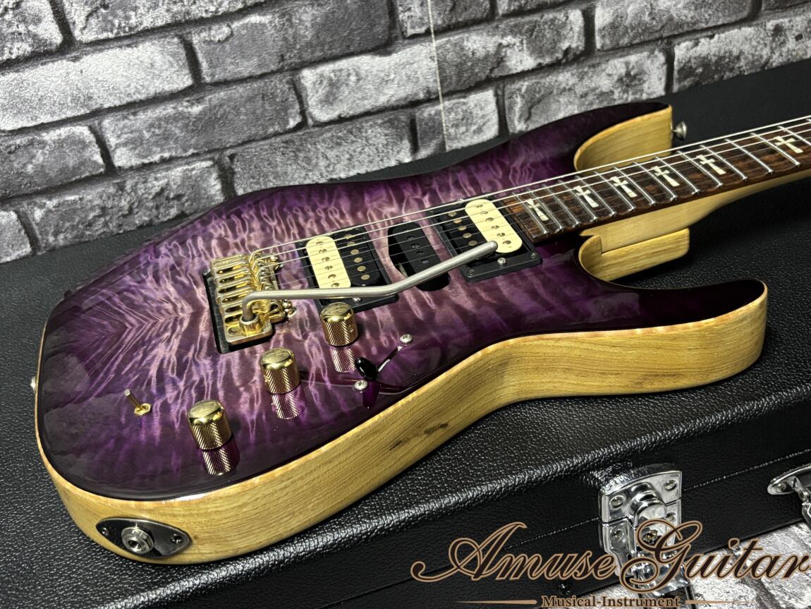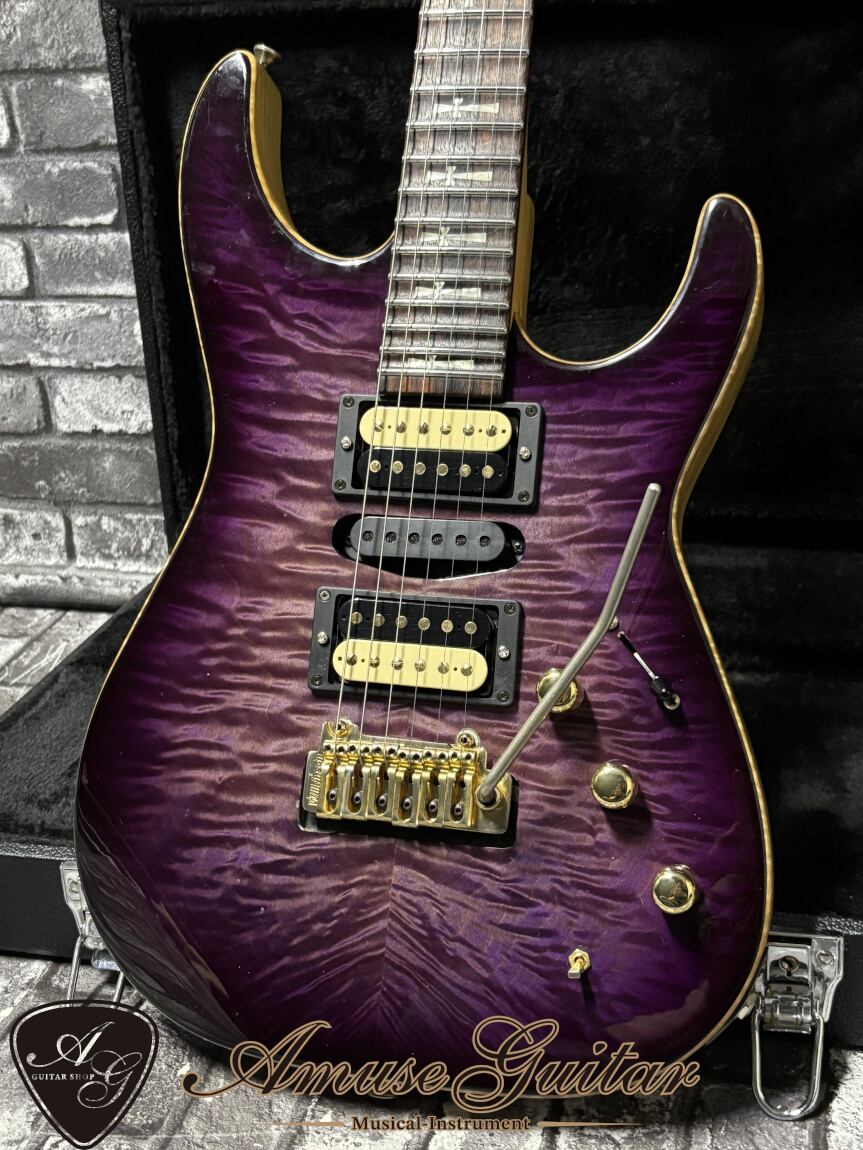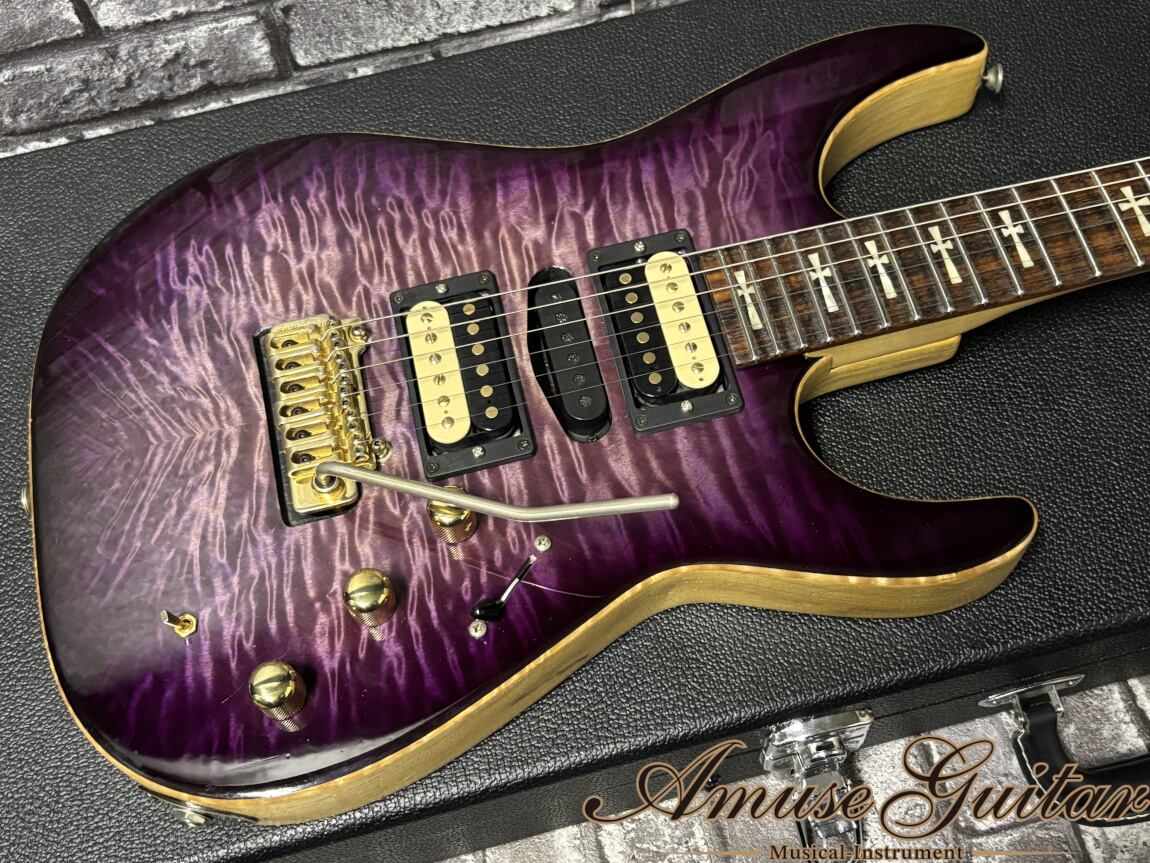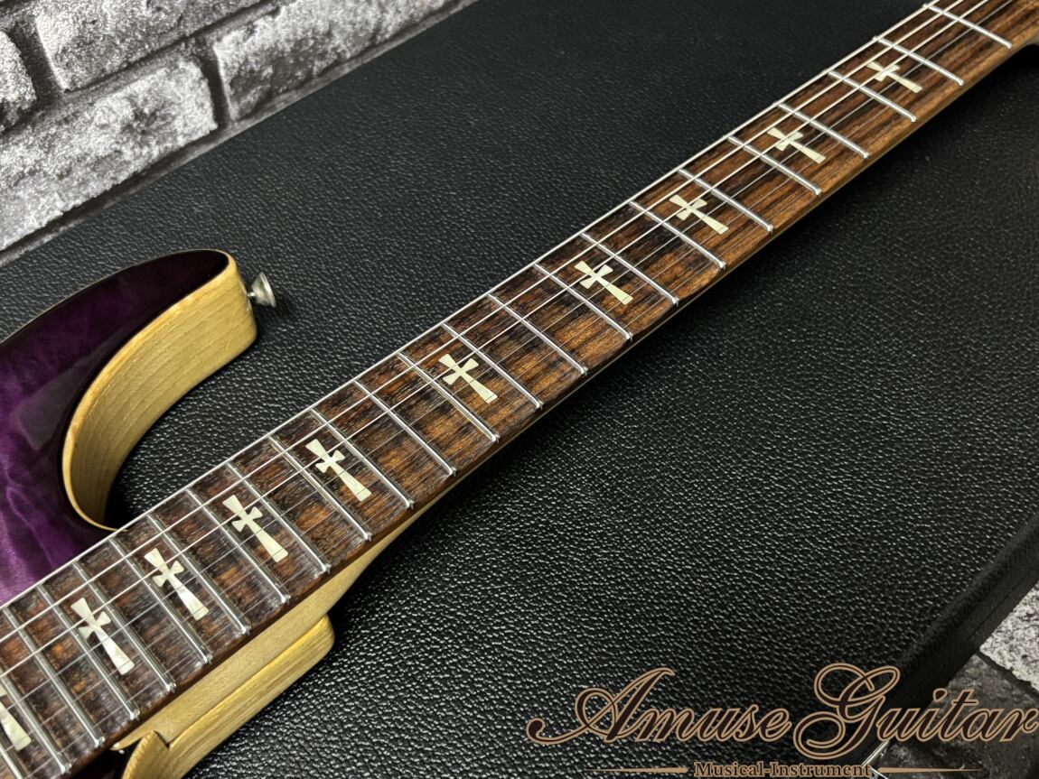 此方のスペックは、板目取りメイプルネック、ローズウッド指板に、ボディはアッシュバック/2Pキルテッドメイプルトップの木材マテリアル。ロングスケール、ミディアムジャンボの24フレット、ナット(グラフテック)幅約42.5mm、12R、約13度の角度付きヘッドのボルトオン構造です。ボディトップはグロス仕上げのパープルサンバーストで、それ以外は塗装の剥がされたナチュラルオイルフィニッシュ仕上げ。ヘッドはオリジナル形状、ヘッドトップにはデカールロゴ、ペグはGOTOH製のトップロックタイプ、指板インレイには“Celtic Cross”、8~24フレットに浅めのスキャロップ加工(所謂ハーフスキャロップ)、スラントしたネックジョイント部、ブリッジには2点支持ウィルキンソン、センターピックアップはダミーで2H仕様、コントロールは【3wayPUセレクター/ダミーノブ/マスターヴォリューム/マスタートーン/コイルタップON⇔OFF】、サイドジャック等が特徴として挙げられます。
