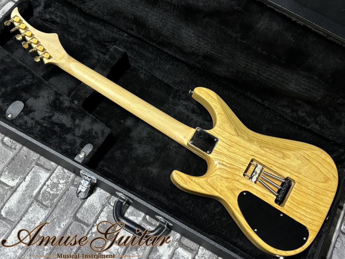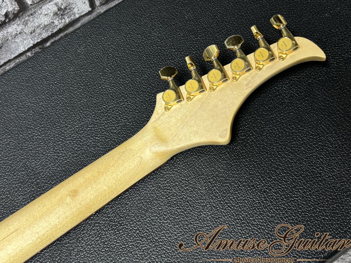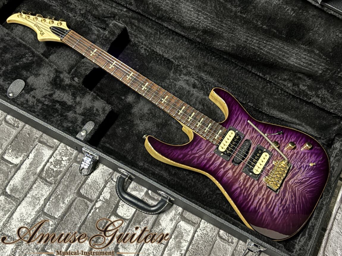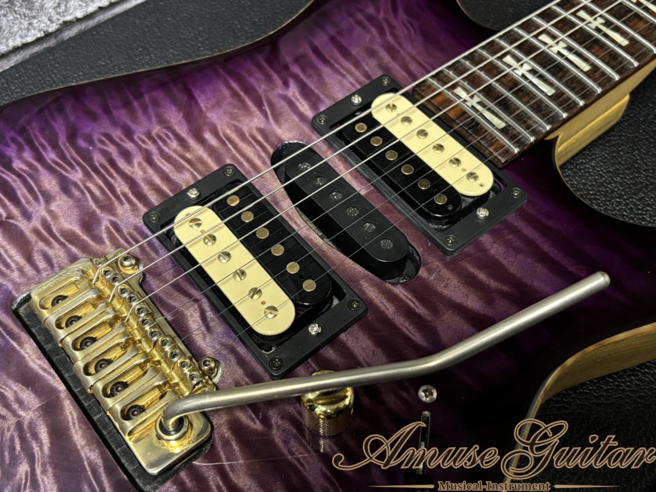 此方のスペックは、板目取りメイプルネック、ローズウッド指板に、ボディはアッシュバック/2Pキルテッドメイプルトップの木材マテリアル。ロングスケール、ミディアムジャンボの24フレット、ナット(グラフテック)幅約42.5mm、12R、約13度の角度付きヘッドのボルトオン構造です。ボディトップはグロス仕上げのパープルサンバーストで、それ以外は塗装の剥がされたナチュラルオイルフィニッシュ仕上げ。ヘッドはオリジナル形状、ヘッドトップにはデカールロゴ、ペグはGOTOH製のトップロックタイプ、指板インレイには“Celtic Cross”、8~24フレットに浅めのスキャロップ加工(所謂ハーフスキャロップ)、スラントしたネックジョイント部、ブリッジには2点支持ウィルキンソン、センターピックアップはダミーで2H仕様、コントロールは【3wayPUセレクター/ダミーノブ/マスターヴォリューム/マスタートーン/コイルタップON⇔OFF】、サイドジャック等が特徴として挙げられます。