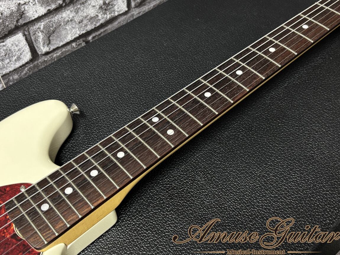 こちらのスペックですが、ボディにはバスウッド、ネックは板目取りのメイプル、指板にはスラブ貼りにて色味の濃いローズウッドを使用した木材マテリアルとなります。610mmのショートスケール、ナット(ボーン)幅約41mm、9.5R、22フレット、ボルトオン仕様でネックシェイプはオリジナルとなる【Char's "C"】で細すぎず、ある程度握り心地のある仕上がりです。他特徴としましては、アイボリーボタンの”Fキー”ペグ、ネック塗装はサテン仕上げ、コントロール類は全てピックガード上に搭載でトグルPUセレクター/マスターボリューム/マスタートーン、Stratocasterに近い感覚でボリューム操作ができるようにコントロールノブの絶妙な位置、ストラト然としたルックスのシンクロナイズドトレモロもこのモデルの為イナーシャブロックをリサイズし特別に設計された特別なものを使用する等の特徴が挙げられます。