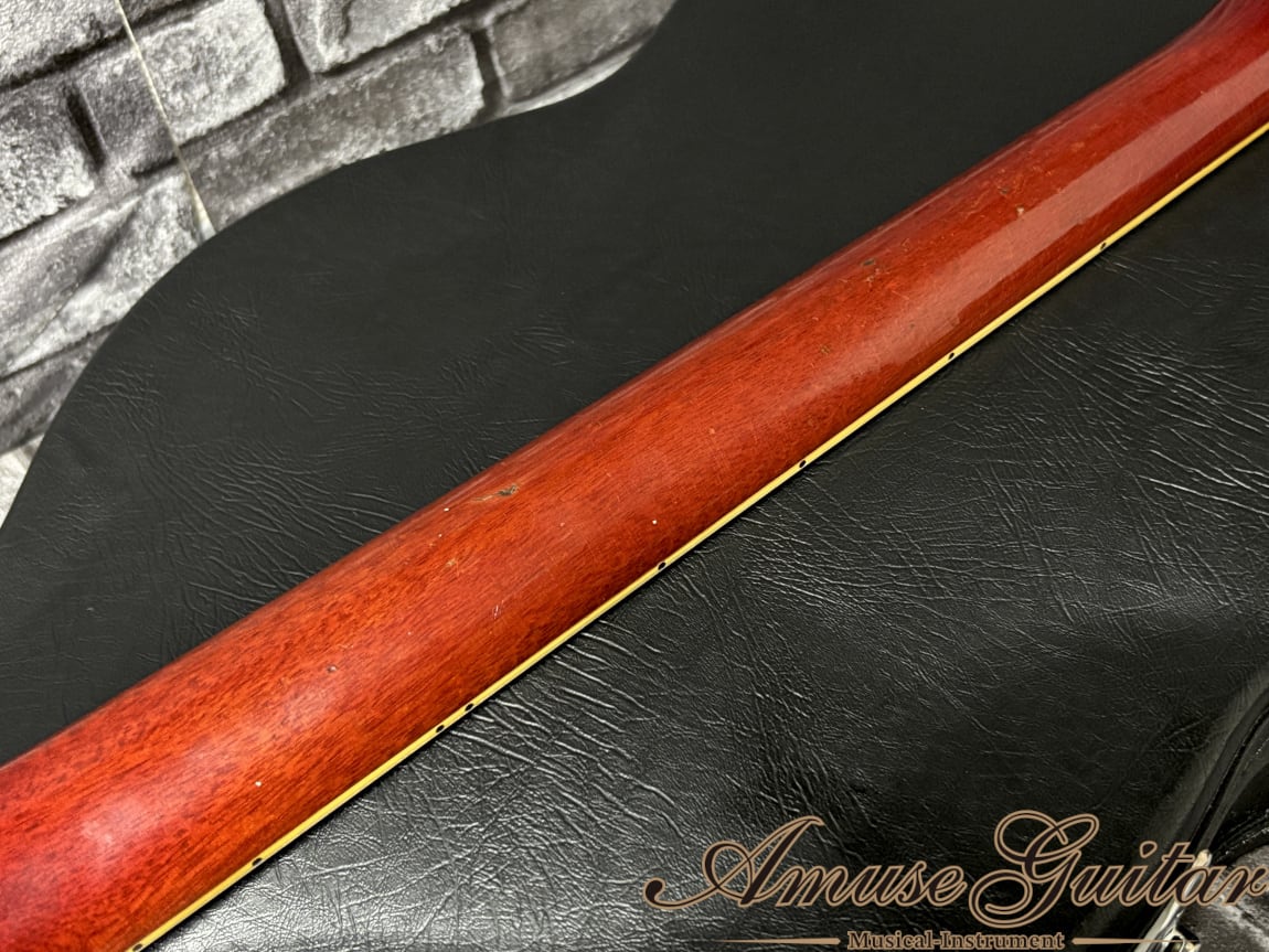 また状態としては、ウェザーチェッキング、ピックガードのシュリンク、ジャック付近の木部リペア、全体オーバーラッカー、ジョイントリセット等、歴戦の使用感はヴィンテージファン泣かせの弾き込まれた激渋のリアルエイジドルックスとなっており、その見た目は貫禄の一言に尽きます。歴代オーナー様による手入れを施されながら使用されてきたプレイヤーズなルックスとは裏腹に、電装関係を始め、その他は全て当時のままのオリジナルパーツをキープ。65デイトポットのハンダはバージン。プレイ面としてはネックコンディションは良好でトラスの余裕もシッカリ残っており、フレットも現状5部山以上とプレイコンディションは上々です。ケースは形状としては近年モノのSG用ハードケースです。