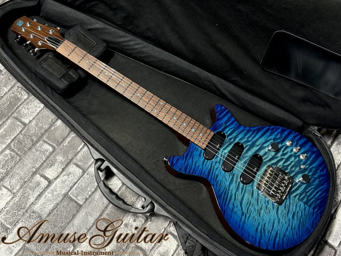 こちらの気になるスペックですが、ボディバックとネック材には希少材となるキューバンマホガニー、ボディトップには杢目の深い極上のAAAAAグレードとなるキルテッドメイプル、そして指板にはハカランダを採用したプレミアムすぎる木材マテリアルとなります。ミディアムスケール(635mm)、ナット(タスク)幅約43.5mm、ミディアムジャンボの22フレット、しっかりとした握り心地を誇るネックのセットネック構造です。その採用材だけでなく他にも拘りのスペックとしまして、木目を生かす濃い青のシースルー塗装、ヘッドトップのブルーロゴメダル、指板のターコイズポジションマークを採用し、この個体だけの統一感が一層引き立てられています。その他としましては、GOTOH MG-Tロックペグ、ケーラートレモロブリッジを搭載し、現在固定しておりますが、もちろんアーミングも可能でその柔らかな使用感は唯一無二です。