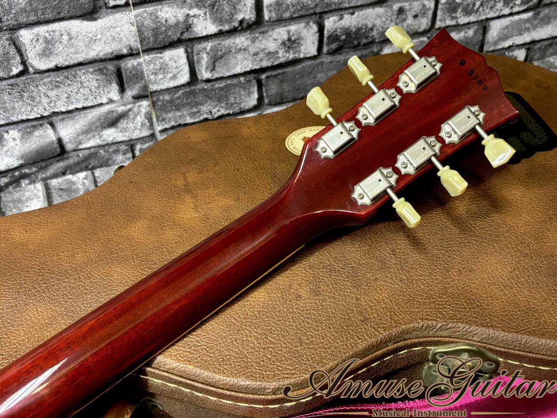 こちらのスペックですが、まず目に入ってくるのはその極上のボディトップ材。”霜降り”という名が相応しい明らかにハイグレードなフィギュアドメイプル。そしてボディバックには1Pマホガニー。ネックにも木目の整ったマホガニーに、指板には使用したエビデンスこそないもののハカランダしか見えない導管と色濃さをもつローズウッドが使用された木材マテリアル。フィニッシュは94~96年辺りに見られる通称【Darker Transparent Orangy Cherry Sunburst】とも呼ばれるHeritage Cherry Sunburst。その他はレスポール然としたスペックを基本とした仕上がり。その他としましては、クルーソンペグには”DELUXE GIBSON”の刻印、ディープジョイント方式、ヴィンテージスタイルT.O.M & テイルピースのブリッジ、コントロールキャビティ内“R9”刻印、CTS POT、スプラグ製セラミックコンデンサ等の特徴が挙げられます。