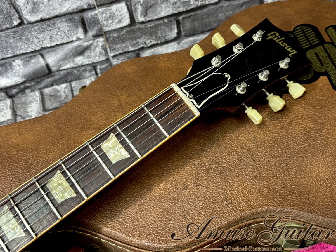 気になる状態ですが、細かな打痕、スレの他、ナット部上面が綺麗に成型し直しされている等の変化が見られますが、恐らく交換個所の無いフルオリジナル状態となっており、良好なコンディションをキープしております。ネック状態も良好で、トラスロッドの余裕もシッカリと確認済み。フレット残りは6~7割以上。付属品につきましてはオリジナルGIBSONロゴ入りブラウンハードケースです。