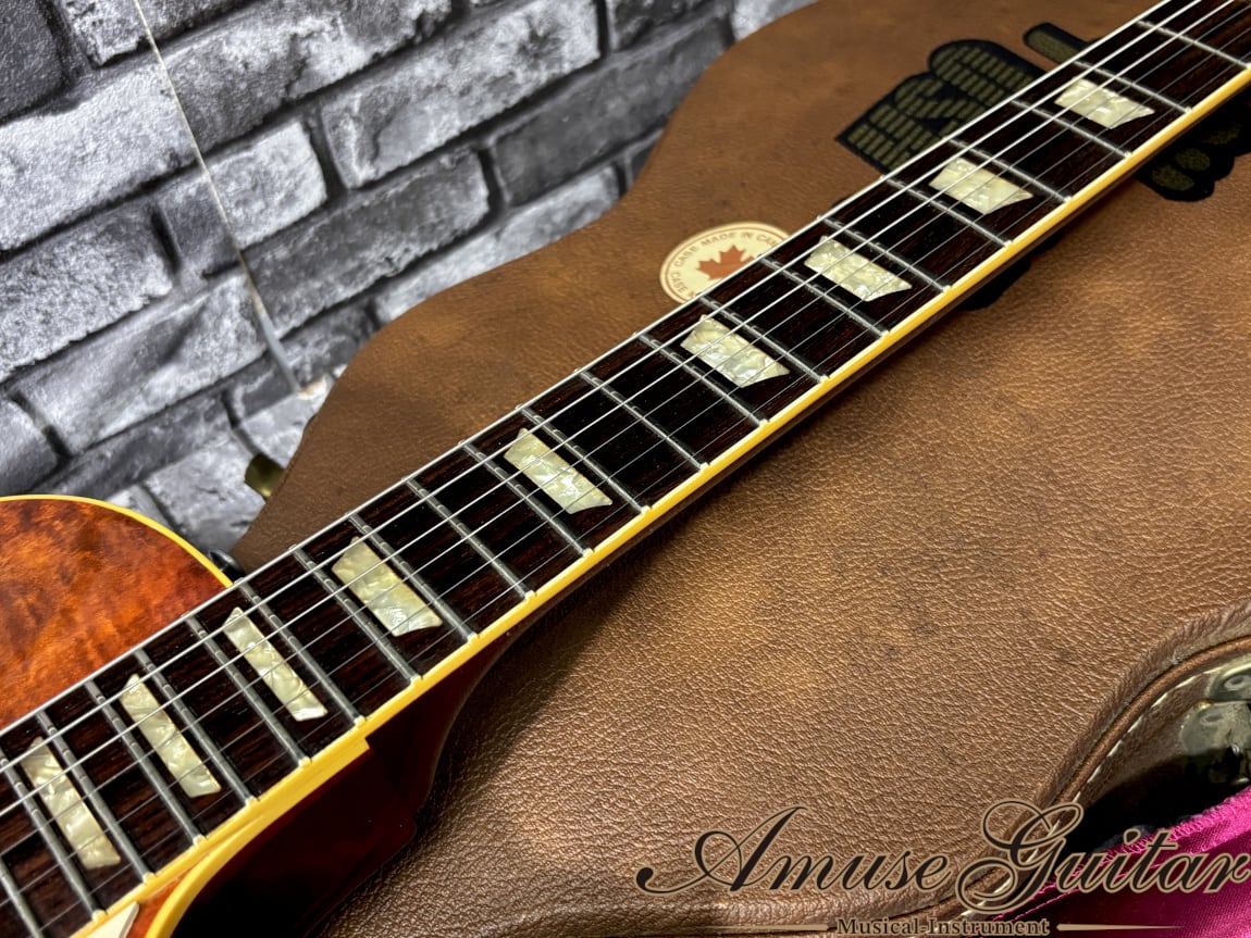 今回ご紹介させていただきますのは、そのGibsonが1995年に製作した1959年リイシュー(R9)となるレスポールです。1993年より生産が開始されたHistoric Collectionの初期モノとなる一本。採用材に、通常では使用されない様なハイグレード材を使用した逸品で、最高峰の一本としてご納得いただけるお勧めの個体です。