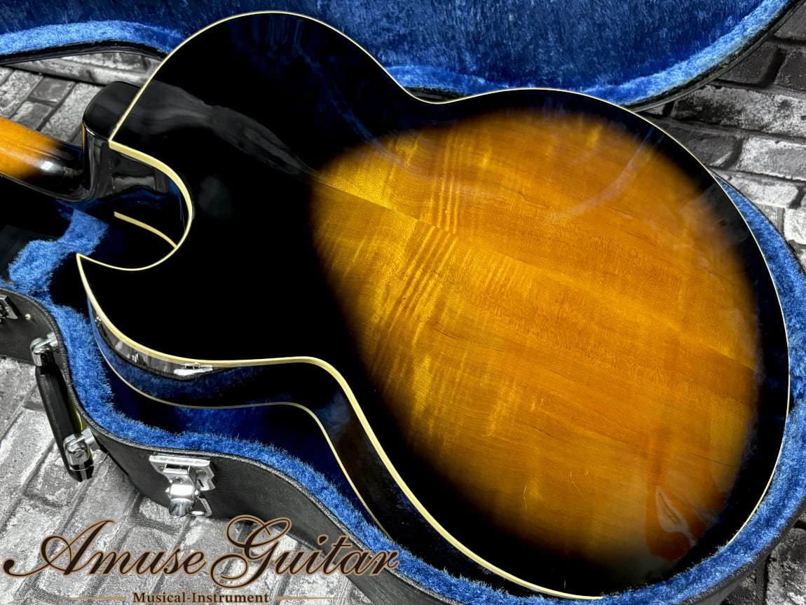 此方のスペックですが、ボディトップに単板スプルース、ボディサイド&バックに単板メイプル。特にバックのメイプルは、フィギュアド杢目が深く高級感抜群のハイグレードなものが採用されている事が分かります。ネックにもメイプル、指板&ブリッジには色濃いローズウッドを採用した木材マテリアル。640mmのロングスケール、ナット幅約42mm、20フレット、ヘッド角14度、握り心地がありつつ太すぎないCシェイプグリップのセットネック構造。特徴としましては、ヘッドトップにマザーオブパールのJ.K.CHAKIロゴ、グローヴァーペグ、0フレット、1フレット指板上に【勘】マーク、フローレンタインカッタウェイ、センターブックマッチFホール、アジャスタブルブリッジ、テイルピース等が挙げられます。その他、ボディ厚約95mm、ボディ幅約425mm。ボディ内部スタンプシリアルは【00034】と奇跡の2桁となっており、かなり初期に製作されたものと推測されます。