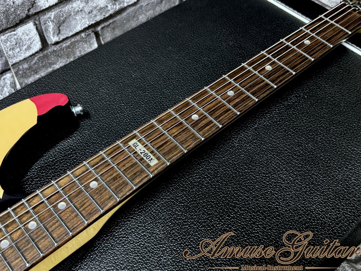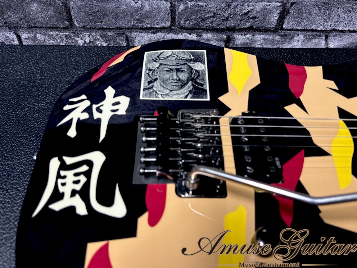 此方のスペックは、ボディにバスウッド、ネックには板目取りのメイプル、指板にはローズウッドを使用した木材マテリアル。ロングスケール、ナット幅43mm、22フレット(ジャンボサイズ:XJ Frets)、薄めの“GL Original U Neck”シェイプのボルトオン構造。その他としましてはヘッド&ボディに特徴的なKamikaze Graphic、リバースバナナヘッド、Floyd Rose Specialのロックナット&ブリッジ、ジョイントはカットが施されておりハイフレットのアクセスも向上、コントロールはマスターボリュームに搭載されたPush⇔Pullスイッチによりリア⇔フロントのピックアップ切り替えができるシンプルを極めた設計、サイドジャックはストラップピンにかけやすい角度にて組み込み、ストラップピンはシャーラーロック対応の物(換装)が特徴として挙げられます。