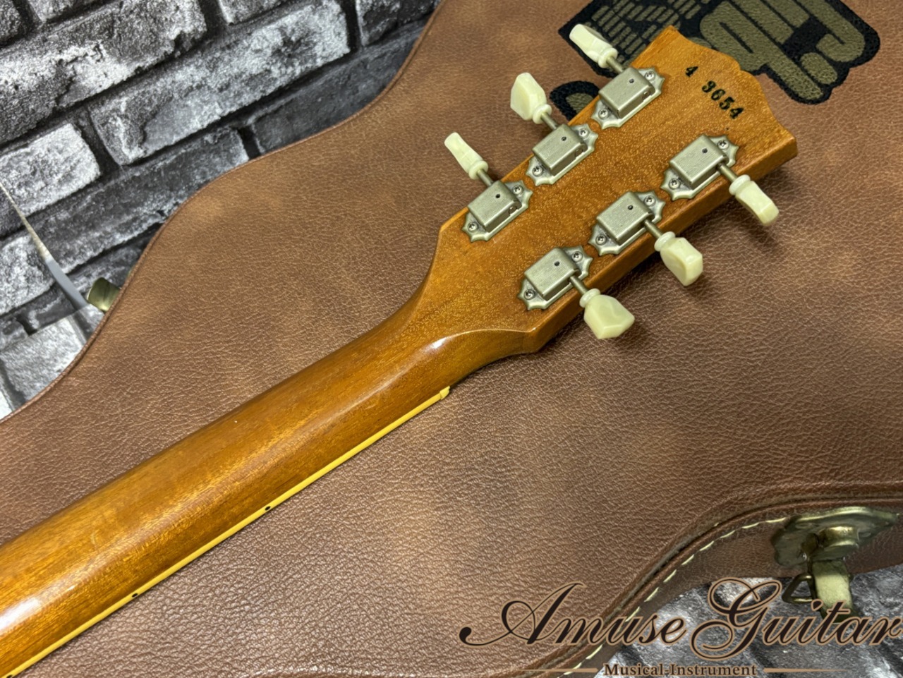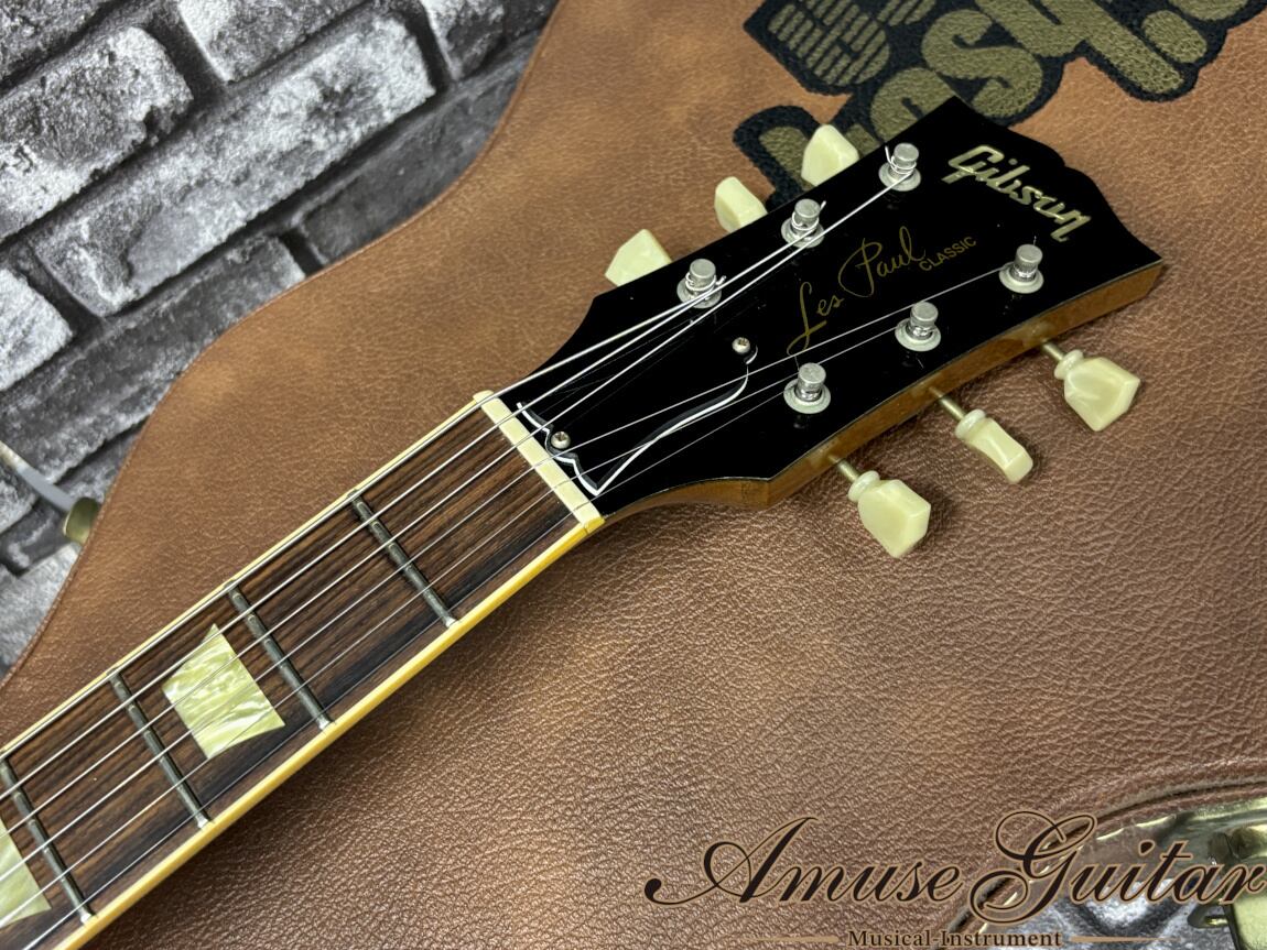 今回ご紹介させていただきますのは、そのGibson社が「1960年型バーストの雰囲気を味わえるモデル」を1990年代に発売した【Gibson Les Paul Classic】です。80年代後半~90年代初頭のバースト回帰志向の市場の空気感にマッチングした使用に仕上げられており、Gibson Les Paul Standardよりも上位(高額)モデルであった事もあり、現在でも中古市場にて人気のモデルとなっております。今回の一本は、歴代オーナー様により各部パーツなどが変更されておりサウンド&ルックスにもこだわった逸品です。
