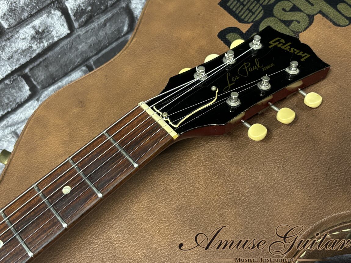 こちらのスペックですが、ボディには贅沢に1Pマホガニー、ネックにも1Pマホガニーと、指板にはハカランダの様な木目/導管が確認できるローズウッド材を使用した木材マテリアル。ミディアムスケール、ナット幅約43mm、12R、22フレット、薄めのUシェイプを採用したセットネック構造。この時代のレギュラーラインナップのスペシャル(シングルカット)リミテッドエディションならではの拘りポイントが多数あり、【GIBSON DELUXE】刻印のクルーソンペグ、ヘッド裏に” Limited Edition”のロゴ、ドックイヤーのP-90、ラップアラウンドブリッジが見受けられます。その他としては、ヘッドには“Les Paul JUNIOR”ロゴ、釣鐘型トラスカバー、べっ甲柄ピックガード等が特徴として挙げられます。
