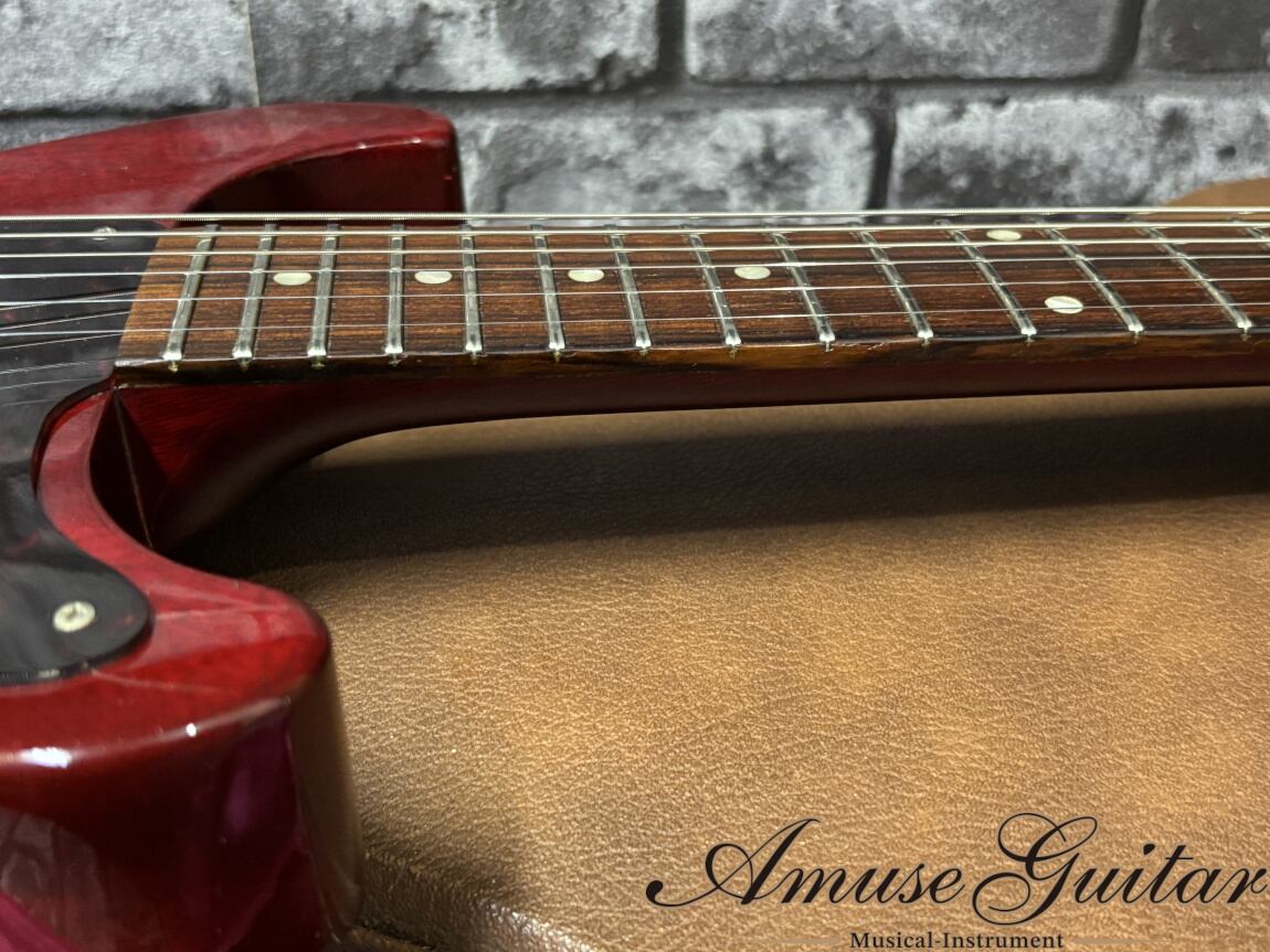 今回ご紹介させていただきますのは、そのLes Paul Jr.のダブルカッタウェイシェイプのリイシューモデル。1996年に当時の正規代理店である山野楽器がギブソンにオーダーしたレアアイテムです。90年代当時の優れたクオリティの木材がこちらにも採用されており、山野楽器の厳しいクオリティコントロールにもクリアした”末永く使える一本”となるオススメ品です。