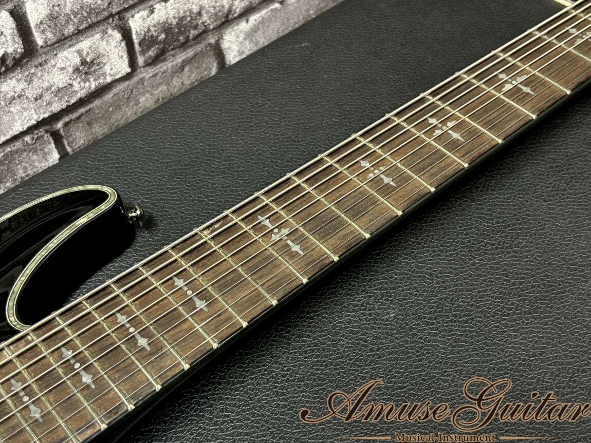 今回ご紹介させていただきますのは、そのシェクタージャパン企画のダイアモンドシリーズの中の“8弦”の一本。アーチトップ&セットネックの間違いないスペックに併せ、最上級のパーツ、ルックスにも拘った他とは一味も二味も違う珠玉の個体です。ラウド系界隈にも支持されることが納得できるハイエンドで、8弦ならではの“Low F#”の極悪なサウンドも楽しめます。