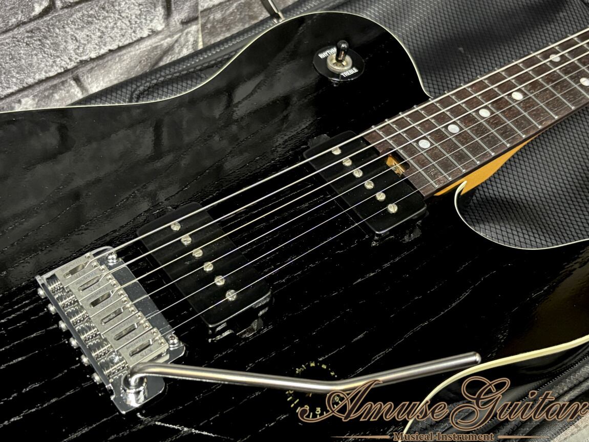 こちらのスペックですが、2Pのライトウェイトアッシュ(ボディ厚44mm)、ネックには板目取りのハードメイプルに、指板はスラブ貼りの色濃いインディアンローズウッドを採用した木材マテリアル。ミディアムスケール、ナット(TUSQ)幅42mm、ステンレス素材のミディアムサイズフレット(22F)、ネックグリップは握りやすいCシェイプとなるボルトオン構造。ボディフィニッシュはグロスブラックのオープンポア仕上げで、アッシュ材の木目を生かした”シンプルながらカッコイイ”ルックスです。その他、GOTOH SG381 MG-Tのダイヤルロック式、ノンストリングガイド、マザーオブパールのポジションマーク、ネックサイドポジションには蓄光素材、ネック調整が容易なホイールトラスロッド、ネックジョイント部はカットの入っておりハイポジションも高い演奏性、二点支持シンクロナイズドトレモロのGOTOH NS510T-FE1(with/KTSチタンSaddle)、コントロールはLP的位置のPUセレクター/マスターヴォリューム/フロントトーン/リアトーン、ヴォリュームにはハイパスコンデンサ、フロントトーンのコンデンサにGudeman(ヴィンテージ)、リアトーンのコンデンサにPyramid(ヴィンテージ)、ストラップピンはシャーラーロック対応等の特徴が挙げられます。
