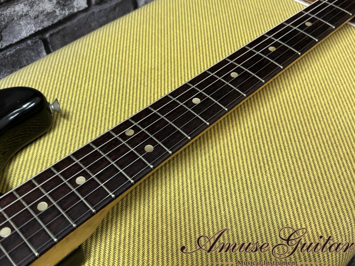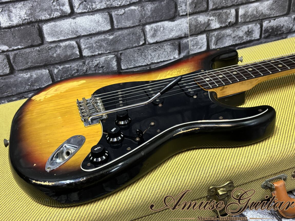 こちらのスペックですが、ボディに2Pのアッシュ、ネックには板目取りのメイプルネック、指板にはラウンド貼りのローズウッドが使用された木材マテリアル。ロングスケール、ナット幅約40.5mm、21フレット、7.5R、薄めのCシェイプとなるボルトオン構造。塗装はこの期間ならではのシック・スキン・ラッカー。その他Fキーチューナー(近年モノのスムーズ可動の物に換装)、ダブルストリングガイド、バレット型トラスロッドナット、三点留めジョイント(with/マイクロティルト)、ブラックパーツ(ピックガード、ノブ等)、ヘッドトップ&ピックガード裏のダブルシリアル、ダイキャストトレモロユニット(サドルはブラス製に換装)、3wayポジションセレクター等の70年代後半特有のスペックが確認できます。