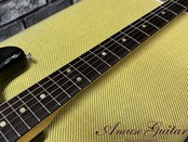 こちらの状態ですが、この年式に見られがちな塗装クラックがネック/ボディに散見、その他打痕、スレ、パーツ経年が見受けられます、その他、ナット/フレットとサドル、ペグの交換は確認できましたが、他はオリジナルスペックを保ったコンディション。裏パネル欠品。トラスロッドの余裕はシッカリと確認済みで、フレット残りは7割程となります。付属品はアーム(近年モノ)、ツイードハードケースとなります。