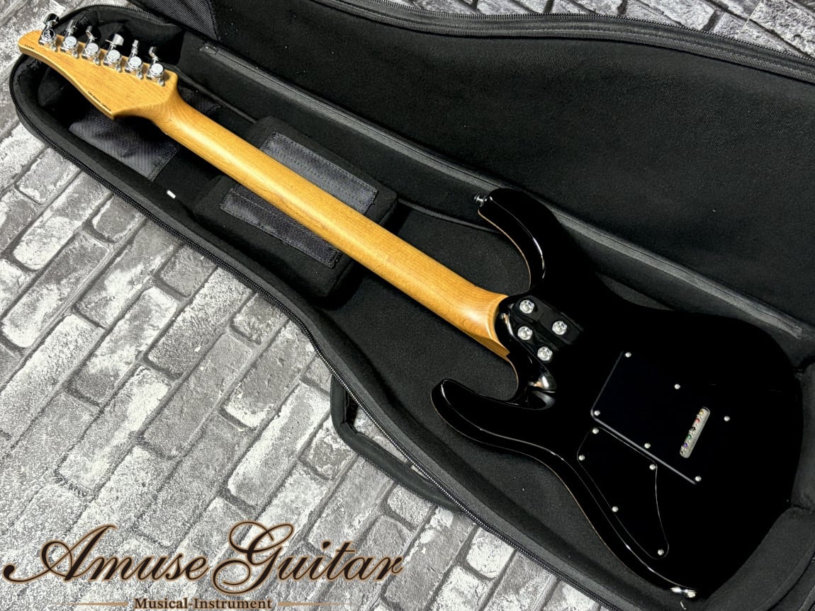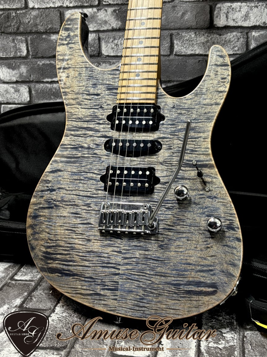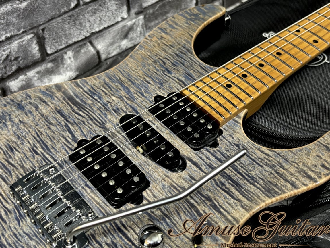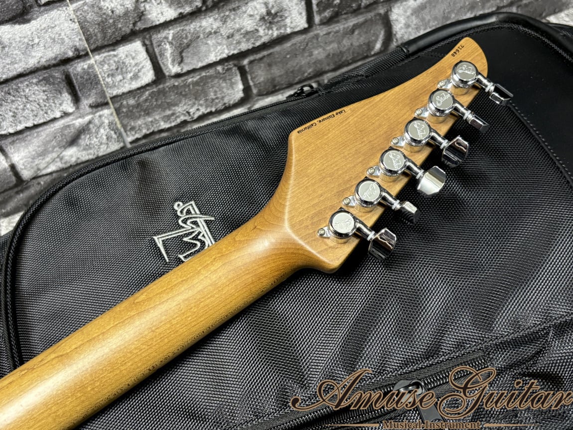 こちらのスペックですが、ボディバックには2Pバスウッド、ボディトップには霜降りのフィギュアドが煌めく2Pフレイムメイプル、ネック/指板には剛性も優れたローステッドメイプルを採用した木材マテリアル。ロングスケール、約41.5mmのナット幅、10-14Rのコンパウンドラジアス、ステンレス素材/ジャンボサイズの24フレット、”Modern Elliptical .800-.850”の厚みで細すぎず、鳴りも意識したネックシェイプを持つボルトオン構造。その他としましては、Suhrオリジナルロッキングペグ、ブラックカラーのヘッド、滑らかなジョイント部ヒール、ブリッジには二点支持シンクロナイズドトレモロGOTOH 510、コントロールはリアルートにて5way PUセレクター/マスターヴォリューム/マスタートーン(w/Push⇔Pullコイルタップ)、サイドジャック等が特徴として挙げられます。