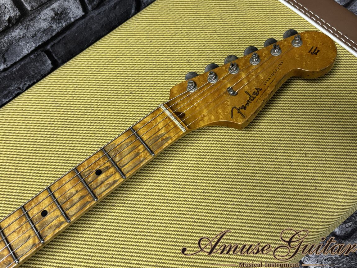 搭載ピックアップはオリジナルとなるブラックボビンに青(フロント)/赤(リア)のドットマーカーが記された60‘sスペックのカスタムショップ製シングルコイル。太くコシのあるハネ感と、ストラト特有の煌びやかさをしっかりアウトプットする反応の良さは流石Cunetto期のレリック個体と頷けるクオリティ。まるでヴィンテージ個体の様な一体感のある”鳴り”はストラトユーザー皆様が納得して頂けるでしょう。「現行のレリック個体とどう違う?」という疑問には大きなポイントとして木材が挙げられます。この反応の良さを持ちながら杢目がここまで美しく表情を見せるネック材を筆頭に、厳しく選定された事を感じる採用材は”この個体を手にしたい”と感じさせてくれる説得力と魅力が溢れています。