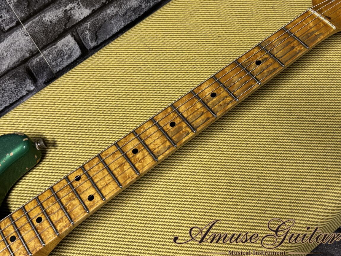 こちらのスペックですが、まず目に入るのは近年ではまずお目にかかれない霜降りフィギュアドの杢目とバーズアイもぎっちりと確認できる極上のメイプルネック材を1Pにて使用。そしてボディはバランスの良いサウンドを重視したアルダーを採用した木材マテリアルとなっています。ロングスケール、21フレット、9.5R、ネックシェイプはCシェイプのボルトオン構造。POTデイト1998年、ボディポケットのデイト1997年製造を確認。その他としましてクネットが手掛けた特徴でもあるヘッド裏のエンボス加工カスタムショップロゴや、ネック/ボディは勿論、パーツ類にもリアルなエイジングが施された圧巻の仕上がりが挙げられます。ネックジョイント面にはマスタービルダー昇格前のジョン・クルーズが監修した印である”John Cruz”スタンプが入れられています。ボディは前述の通りSherwood Green Metallicにフィニッシュされており、全体的なウェザーチェック等のエイジド加工はまるで使い古された本物のヴィンテージギターのようなリアルな存在感です。