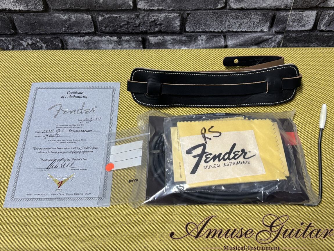 こちらの状態ですが、リアルなレリック加工により判断は難しくなりますが特段の問題が発生するようなダメージは無し。スプリングはローヴィンテージに交換。ストリングガイドと、ノブが交換されている可能性がございます。ネック状態も良好となっており、ネックはストレート。トラスロッドの余裕もシッカリと確認済みで、フレット残りも8割以上は残っておりまだまだ使えるコンディション。付属品は、認定証、新品時付属品(一部未開封品/画像参照)、オリジナルフェンダーブラウントーレックスハードケース、元箱です。