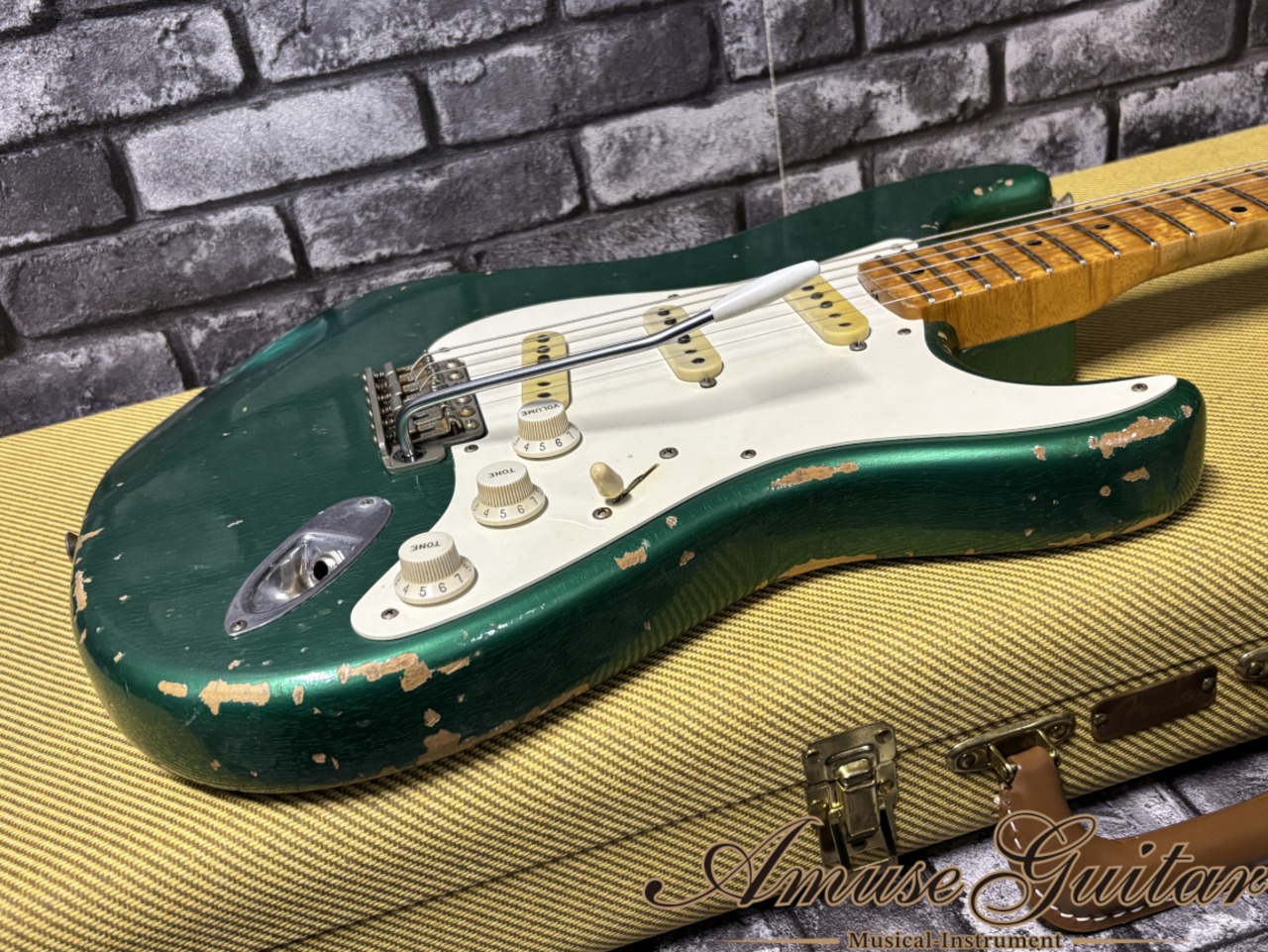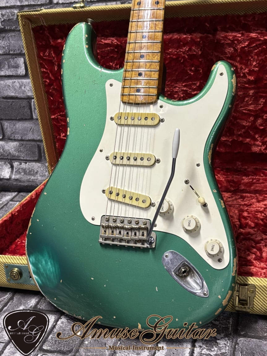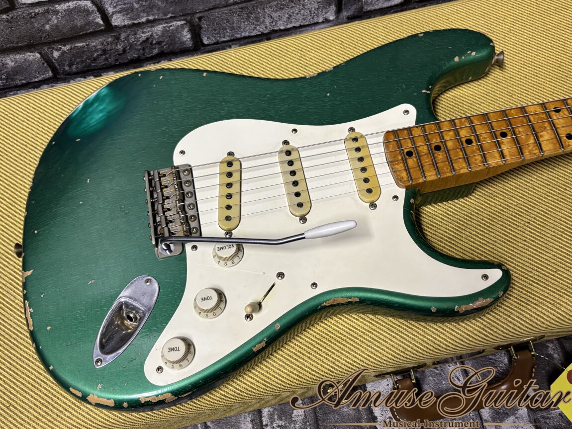 今回ご紹介させていただきますのは、そのクネットがレリック加工を手掛けた希少な一本。1958年スペックを採用したこちら、クネットが手掛けたことが納得できる圧巻のレリック加工と、極上の選定材、そして激鳴りというにふさわしい木材の奥ゆかしいサウンドの広がりが特徴の一本。フィニッシュは“この時期にこんなカラーラインナップがあったのか”と、STフリークもビックリのシャーウッドグリーンメタリックで争奪戦必須です。そしてなにより、この個体は前所有者様が大事に保管していた状態が素晴らしく、なんとFender出荷時の元箱も付属した奇跡の状態で、プレイヤー/コレクター多方面にご納得いただける逸品です。