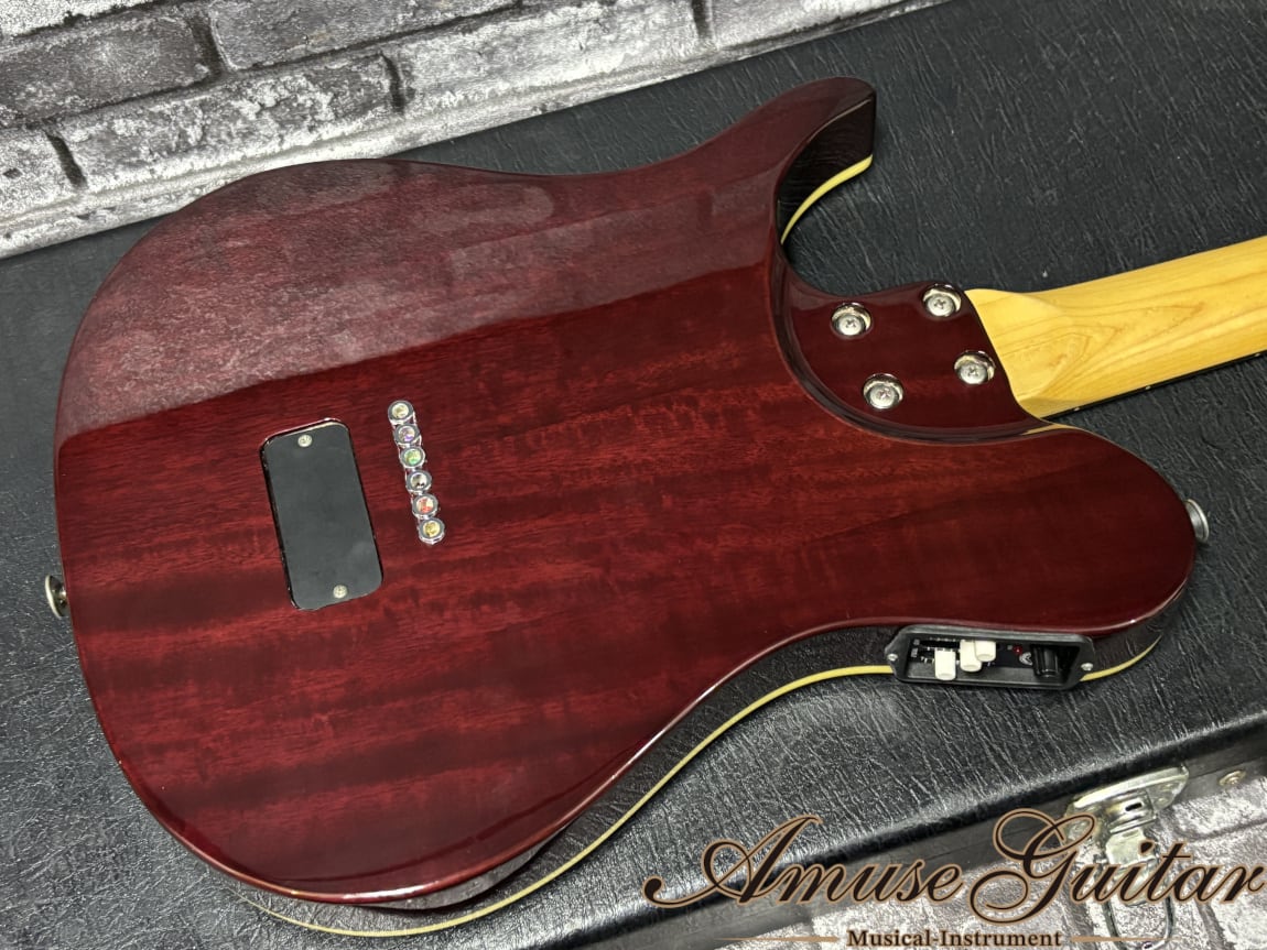 こちらのスペックは、ボディにチェンバード加工されたフィギュアド杢目も確認できる良質なマホガニーに、杢目の優れたキルテッドメイプルをトップに採用。ネックには板目取りのイースタンメイプルに、近年ではなかなかお目にかかれない色味の濃いローズウッド指板、ブリッジ部にもローズウッドを用いた木材マテリアル。ロングスケール、ナット幅41mm、24フレット、12R、細めのグリップシェイプとなるボルトオン構造。テレキャスターを基本としたシェイプ。特徴としましては、ネックはサテン仕上げ、ポストの高さが各弦で異なるクルーソンタイプのペグ、指板に大き目のパールドットインレイ、ボディはグロス仕上げ、ノーコンター、ボディジョイント部にはハイフレットアクセス向上の加工、ボディバックに9V電池収納、弦は裏通しスタイルです。
