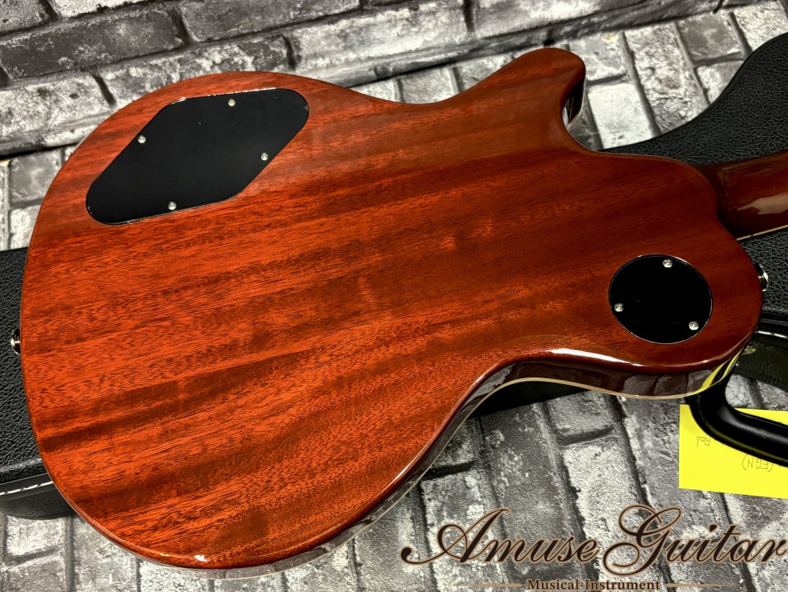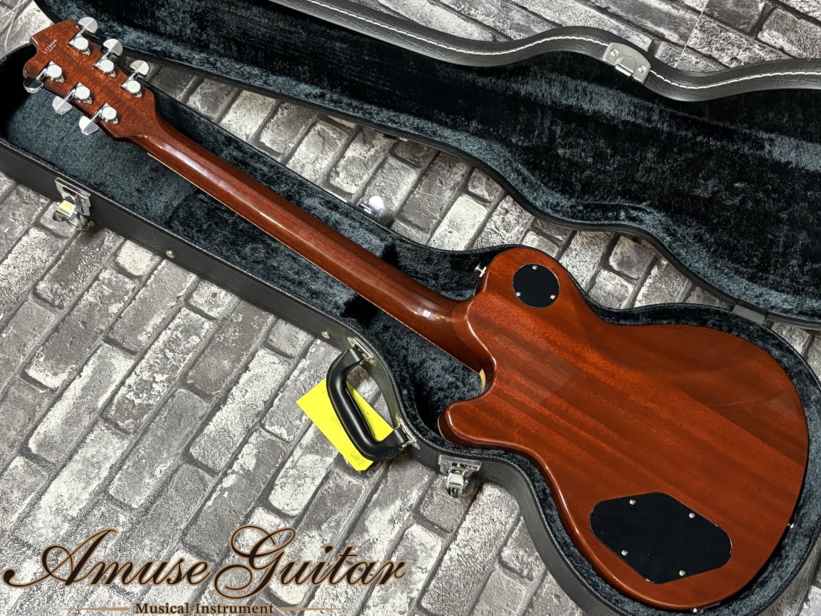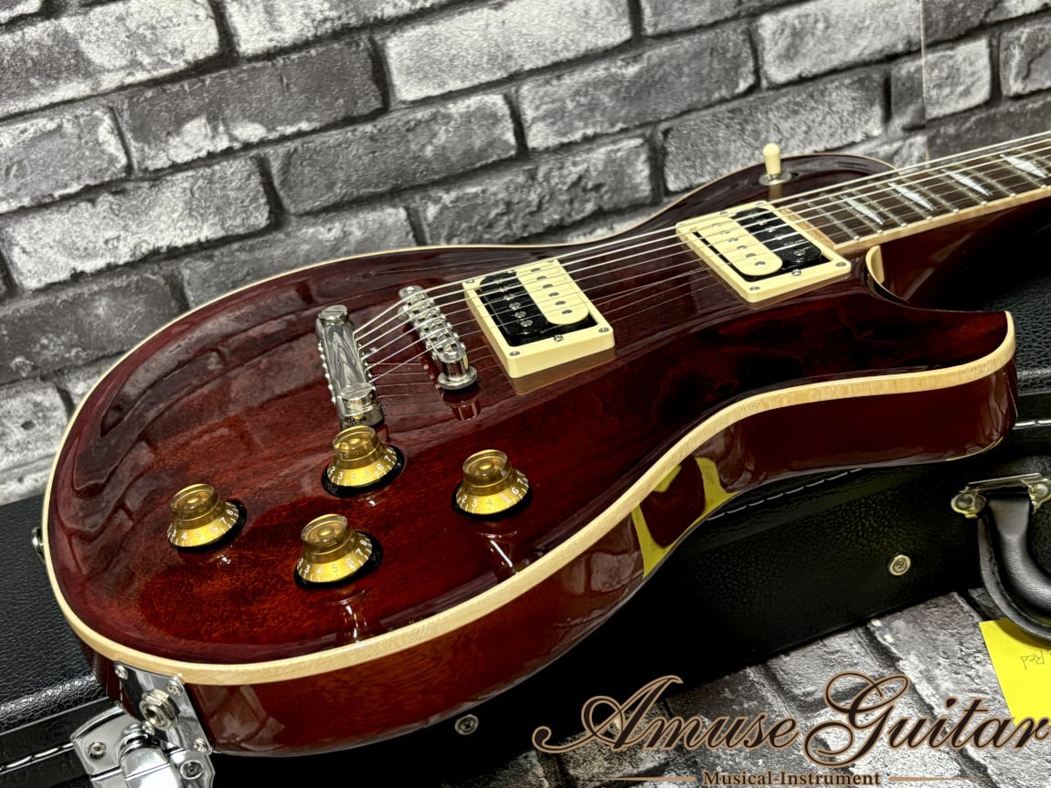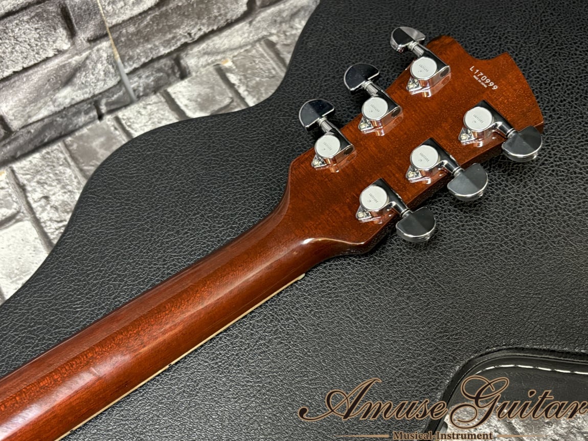 こちらのスペックは、ボディトップにハードメイプル、ボディバックにはマホガニー。ネックは1Pマホガニーに、指板はローズウッドを使用した木材マテリアル。628mmミディアムスケール、ナット幅42mm、305R、ミディアムジャンボの22F、薄めのシェイプとなるセットネック構造。独自シェイプのアーチトップボディは非常にグラマラスで高級感の溢れる雰囲気をまとっております。そしてサークル・フレッティング・システム(CFS)の採用も大きな特徴の一つ。各弦と各フレットが直角に交差する独自構造で、サスティーンが向上し、単音においてもコードにおいても音の抜けがよく、音の立ち上がりも良くクリアなサウンドが得られ、アンサンブル時の存在感も高まります。その他は所謂LP然としたスペックを採用。その他、ペグはGOTOH製で弦の巻き数も最小限のポストトップでのロック式、指板サイドのウッドバインディングはフィギュアド杢目、アルミテイルピース、金属製サイドジャックプレート等がポイントとして挙げられます。