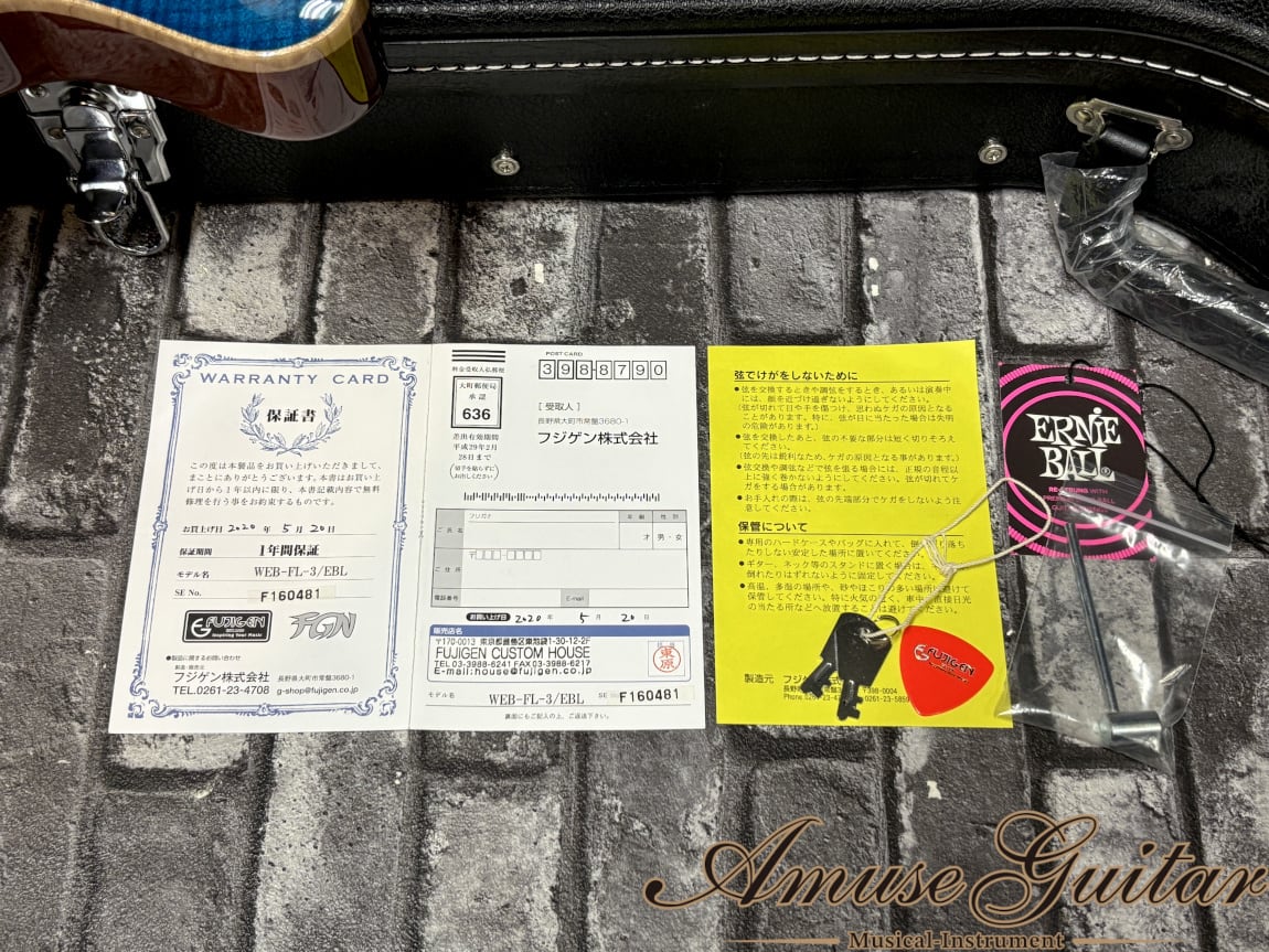 気になる状態につきまして。軽いピッキングスクラッチ、ノブ内部のクラック、スレ、ボディバックに打痕がございますが、目立つダメージは無く、ゴールドパーツの劣化も最小限で良好なコンディションをキープしております。ネック状態も良好で、トラスロッドの余裕はしっかりと確認済み。フレット残りは9割以上とまだまだ使えます。付属品につきましては、メーカー発行保証書(保証書記載モデル名はWEB-FL-3/EBL)、レンチ、オリジナルのハードケースとなります。