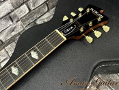 こちらのスペックは、ボディトップに表情豊かな杢目が魅力のフレイムメイプル、ボディバックにはマホガニー。ネックは1Pマホガニーに、指板はローズウッドを使用した木材マテリアル。628mmミディアムスケール、ナット幅42mm、305R、ミディアムジャンボの22F、薄めのシェイプとなるセットネック構造。独自シェイプのアーチトップボディは非常にグラマラスで高級感の溢れる雰囲気をまとっております。そしてサークル・フレッティング・システム(CFS)の採用も大きな特徴の一つ。各弦と各フレットが直角に交差する独自構造で、サスティーンが向上し、単音においてもコードにおいても音の抜けがよく、音の立ち上がりも良くクリアなサウンドが得られ、アンサンブル時の存在感も高まります。その他は所謂LP然としたスペックを採用。その他、ペグはGOTOH製MG-Tロック式、指板サイドのウッドバインディングはフィギュアド杢目、アルミテイルピース、金属製サイドジャックプレート等がポイントとして挙げられます。