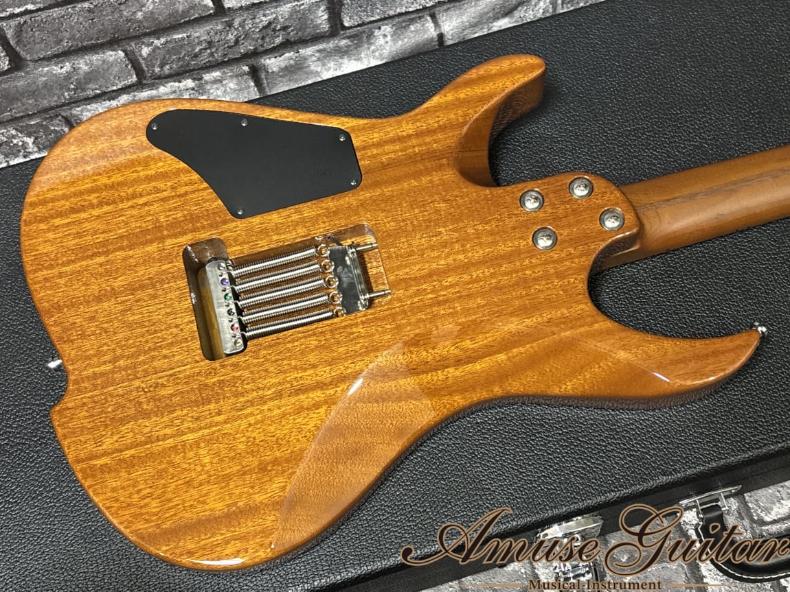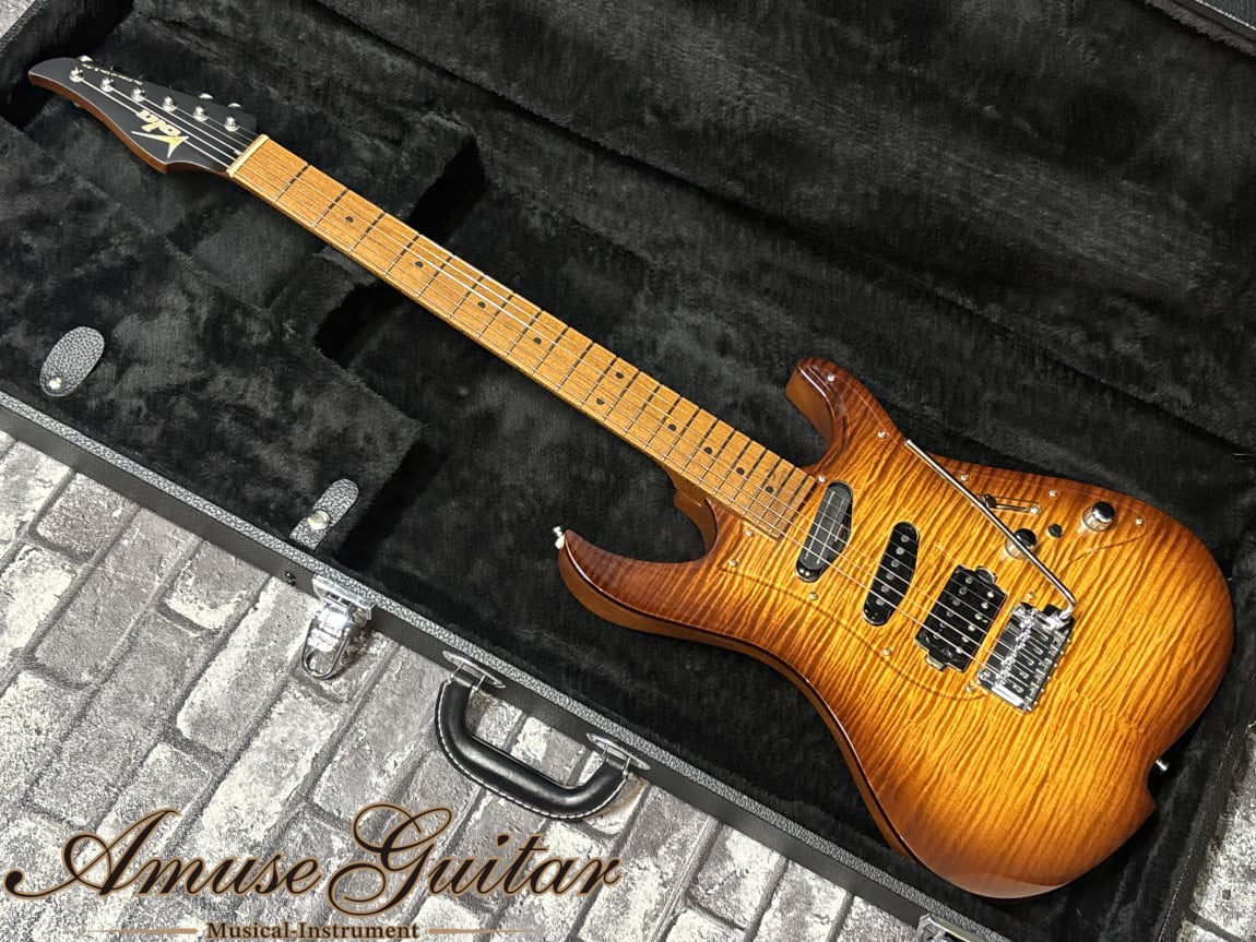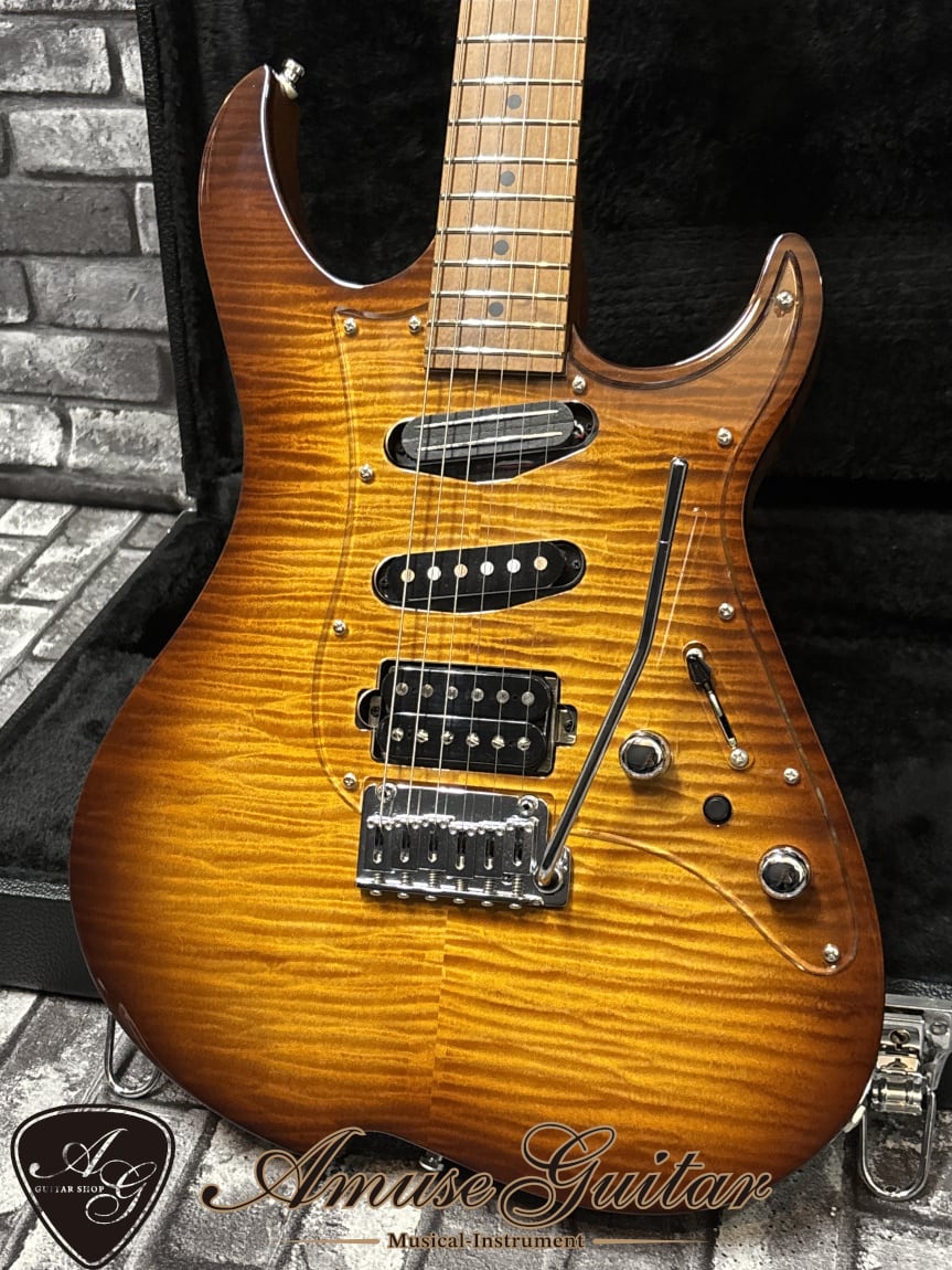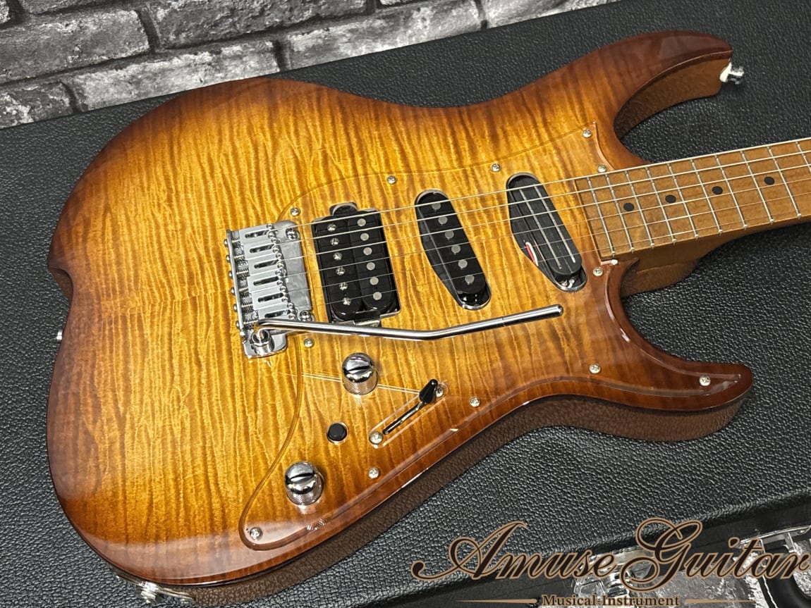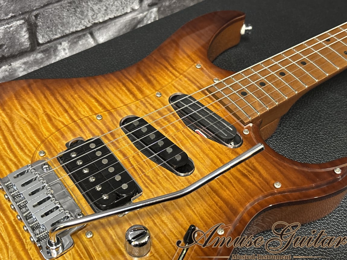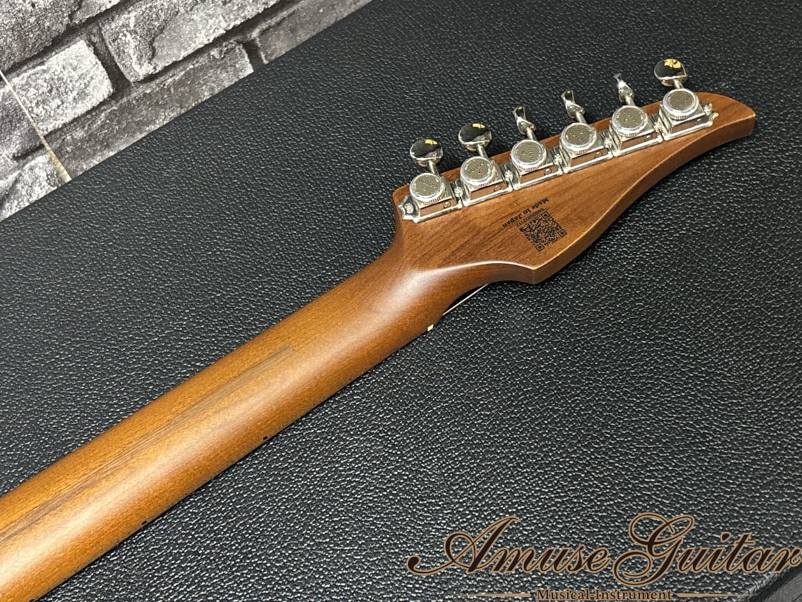 こちらのスペックですが、まずネックには剛性に優れたローステッドメイプルを 1 ピースで採用。ボディにはフレイムメイプルトップ/マホガニーバックの構成となっています。ベントトップとなるメイプルはしっかりと厚みがあり、杢目も深く表情豊かで、サンバーストのグロス仕上げも相まって高級感あふれるルックスです。25.5インチのロングスケール、42mmナット幅(グラフテック)、12R、ミディアムジャンボのステンレスフレット(22F)、グリップは” Vola Modern C Neck Shape”の薄めで握りやすいネックを持つボルトオン仕様。その他としましては、リバースヘッド、GOTOH製MG-Tクルーソンタイプのロックペグ、ノンストリングガイド、ピックガードには杢目の高級感を最大限に生かすクリアアクリル、ブリッジにはGotoh 510T-FE1、シャーラー対応ストラップピン、オレンジドロップキャパシターを採用する等の特徴が挙げられます。