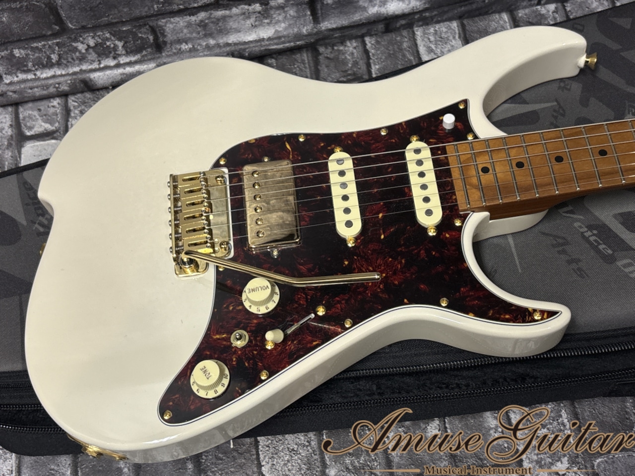 こちらのスペックですが、まずネックには剛性に優れたローステッドメイプルを1ピースで採用。ボディにはアルダーを用いた構成となっています。コンパクトなOZシェイプのボディに、上品なホワイトグロスフィニッシュが映える、シンプルかつモダンなルックスです。25.5インチのロングスケール、12インチラジアス、ニッケル製ミディアムジャンボフレット(22F)、グリップは薄めで握りやすい“Vola Modern C Neck Shape”のネックを持つボルトオン仕様。その他としましては、GOTOH製SD91MG-T-05Mロックペグ、Gotoh 510T-FE1トレモロブリッジをはじめとしたゴールドハードウェアを採用する等の特徴が挙げられます。