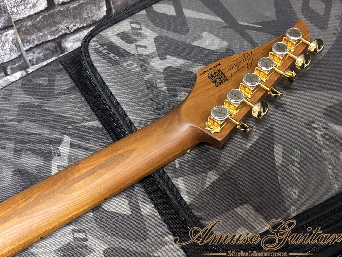 状態につきましては、前所有者様が殆ど使用されずコレクション目的に保管されていた事が伺えるかなりの美品コンディション。パーツに若干の経年、ボディにスレこそ確認はできますが、それ以外のダメージは殆ど無く、ガード類の保護シールもそのままです。勿論ネック状態も良好で、トラスロッドの余裕もシッカリと確認済み。フレット残りも9割以上残りとまだまだ使えます。付属品に関しましては認定証、メーカー発行書類(画像参照)、アーム、フレットガード、オリジナルのGIGケースです。